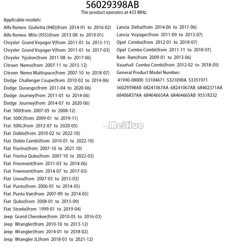 1/4PCS 56029398AB 433MHZ Tire Pressure Sensor For Fiat 500 Doblo Fiorino Freemont Linea Punto Strada Car 41990-08000 53104671