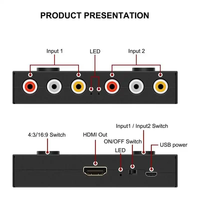 Connect to Two RCA Sources (such as For DVD and For N64) at the Same Time to Avoid Frequent Plugging and Unplugging, Facilitating the Use of Multiple Devices. Input Ports :2xRCA (Yellow, White, Red), Output Ports :1xHDMI-compatible.