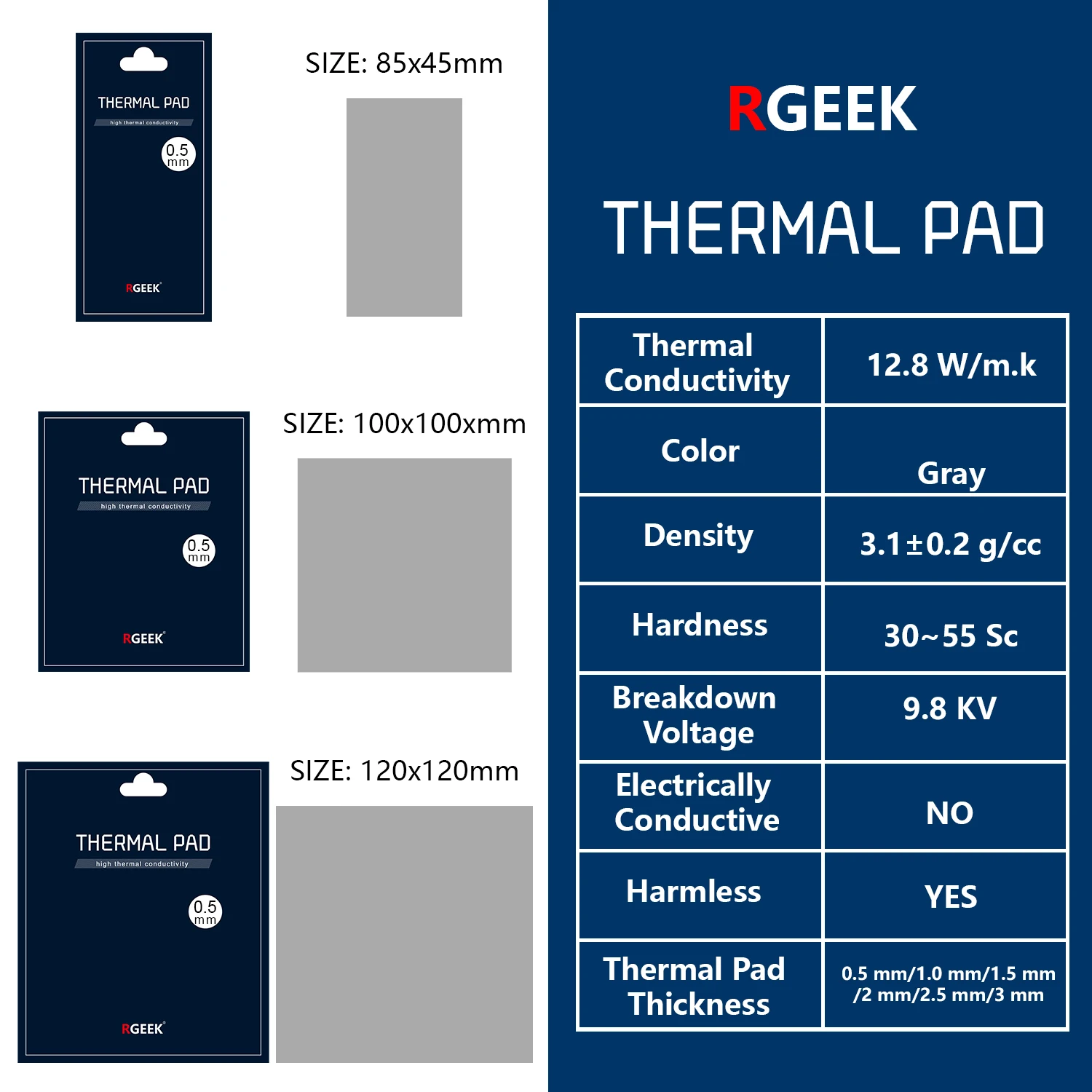 After RGEEK launched high-quality thermal grease, it was highly praised.We adopted new technology to make it easy for all players to use our thermal pad. This Rgeek thermal pad is rated voltage up to 9.8KV and has a thermal conductivity of 12.8 W/mk and insulation. It is safe to use without electricity. This thermal pad is very versatile and easy to use. Example: Notebook computers, Graphics Cards, DRAM memory modules, communication devices, SSD solid state hard drives, car control devices and game equipments, etc.