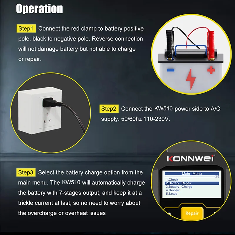 KONNWEI battery tester & charger & repair is the newest battery tester upgraded from the black white screen tester, in order to check battery health faster and more accurate, including check the alternator working status. Not only support Battery Health Test, but also Battery Cranking Test, Battery Charging Test.