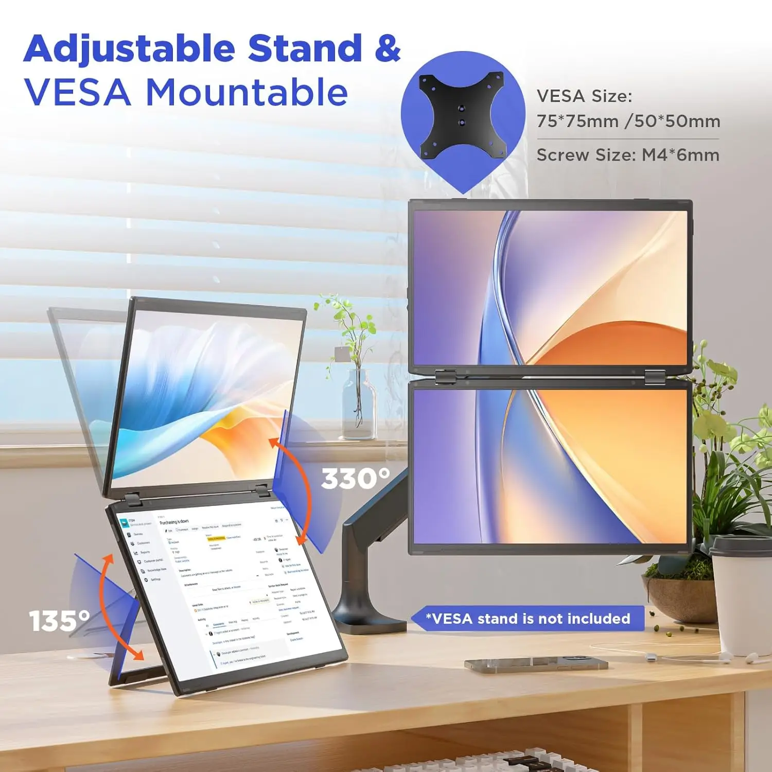 Its built-in 180° adjustable stand allows you to easily tilt, swivel, and pivot the monitor, ensuring that you can find the perfect ergonomic position for your needs. With VESA (75x75mm, M4*4mm) support, you can easily mount the monitor to a wall, monitor arm, or any other VESA-compatible mounting system. Especially valuable for users looking to save desk space or create a multi-monitor setup.