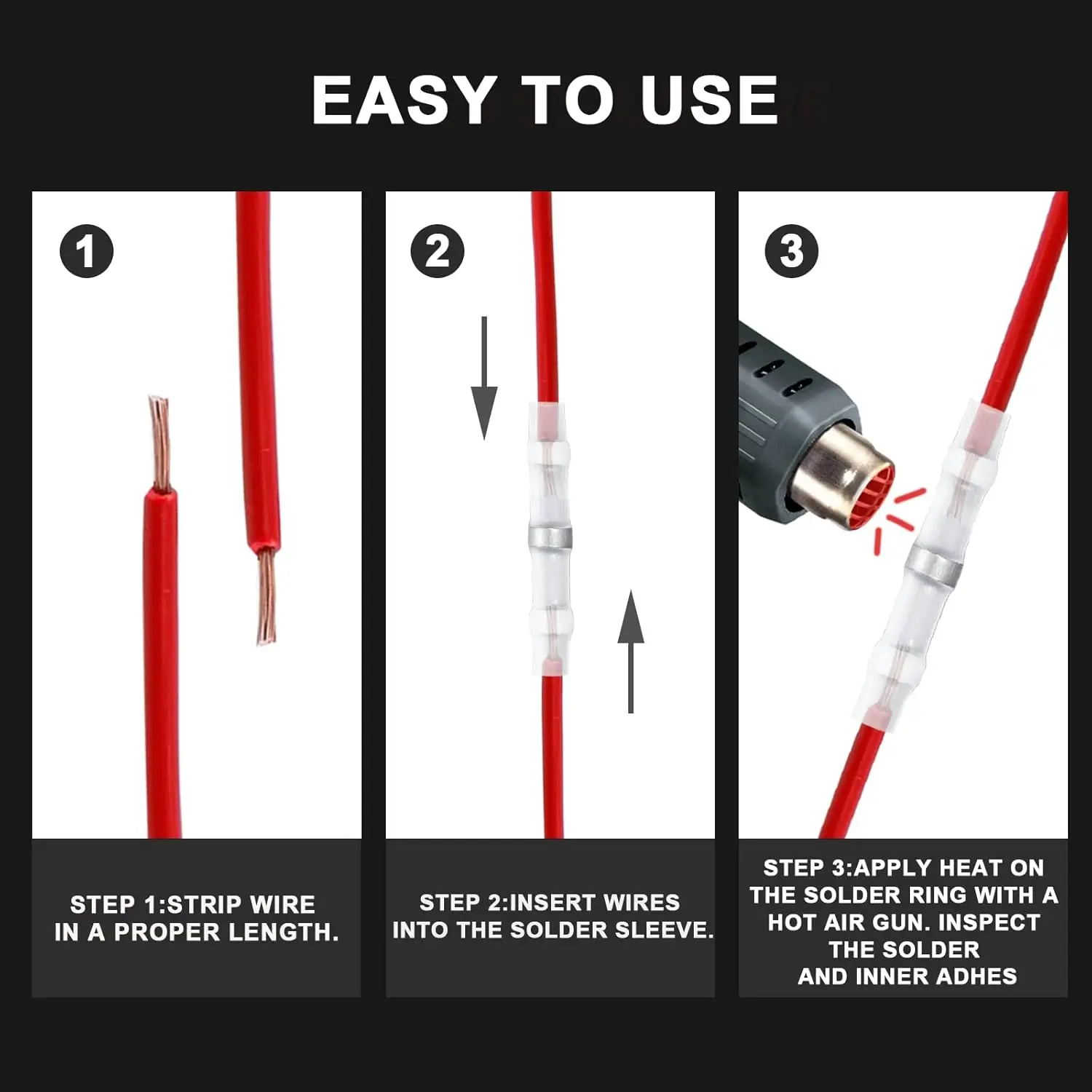 Easy to Use — Just strip the wires and insert into the solder sleeve, then heat it with a hot air gun. The insulating tube will shrink and form a waterproof seal, and the connections are completed.
