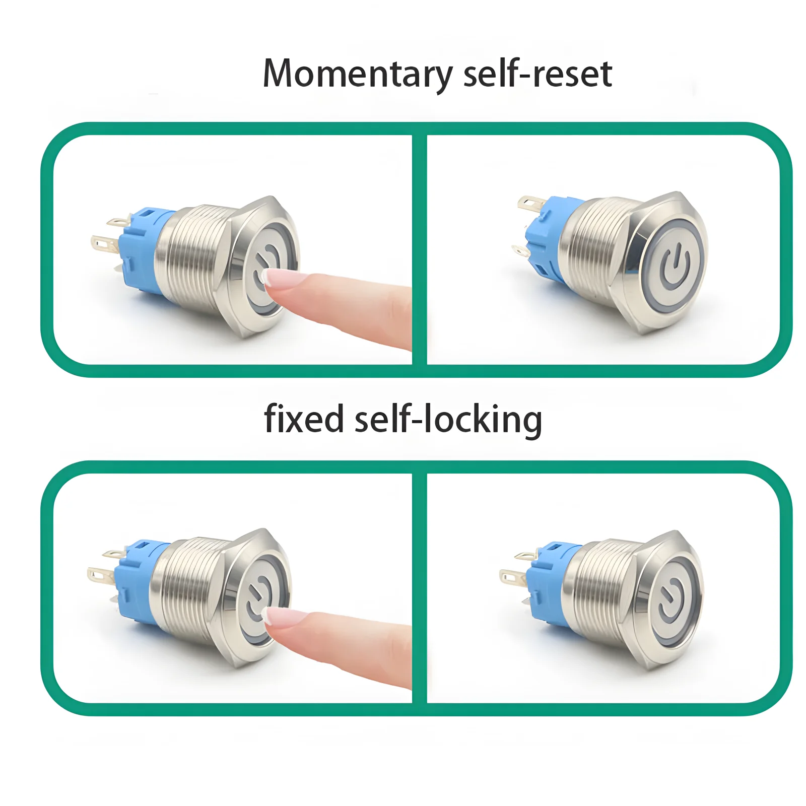 1.Momentary/Self-reset: When you press the button, press-key will automatically return.(Like a car horn switch.Press it-power on, release it-power off.)