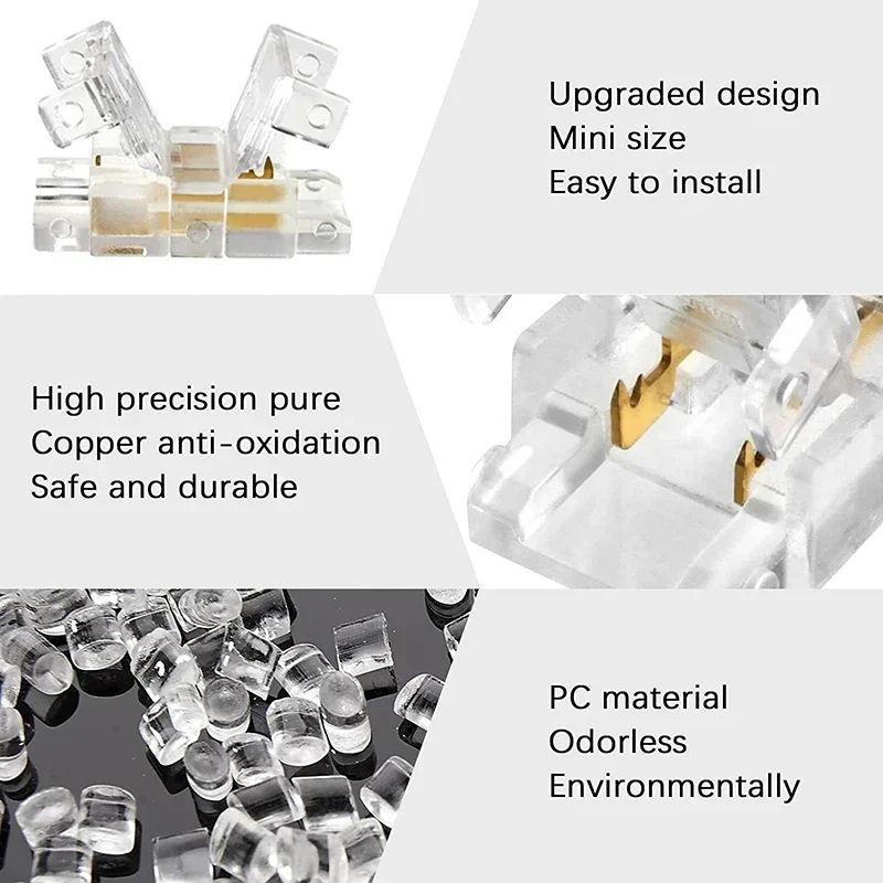 【Product feature】: It can be easily opened by hand without tools and can be reused. The mini design is just right for the light bar and will not fall off. The pure copper material makes it more conductive and will not make poor contact. There is no dark area after connecting the two light strips tightly.