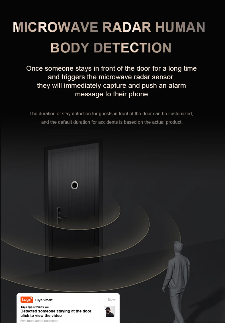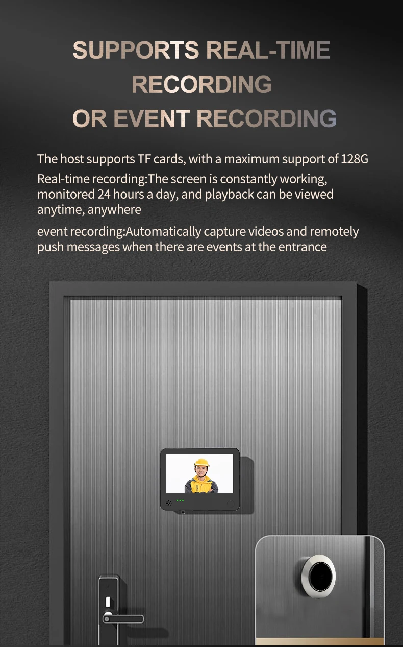 Home Mode: When a visitor presses the doorbell button outside the door, the machine presses the doorbell and lights up the screen to automatically take a picture and store the visitor leaving the home Mode: Press the doorbell button for the first time to prompt the sound, automatically take a picture and store the visitor, the screen does not enter the monitoring mode Excuse me: When a visitor presses the doorbell button outside the door, the machine does not ring the doorbell, it will automatically take a picture and store the visitor After the machine takes a picture, the captured image is saved in the TF card, which can be browsed through the menu or using the card reader on the computer. When a person in the room presses the on/off button, the machine will turn on and display all outdoor conditions on the big screen. When the machine is turned on and the screen displays the picture outside the door, the indoor personnel can press the view button again to complete the photo, the picture will be automatically saved in the TF card, 3 million all-metal zinc alloy material cat eye, anti-theft, anti-prying, anti-cat eye peeping; M7 full glass 300W pixel high definition lens; support a variety of video formats, up to 1080P; equipped with wide dynamic and low light functions, support automatic color to black; 32-bit processor and professional video codec chip; infrared distance 1-2 meters, fully support UI menu style configuration and management; support recording mode or photography mode to prevent personnel from entering; recording mode is divided into 10 seconds, 20 seconds, 30 seconds three time periods; photography mode is divided into one shot, two consecutive shots, three consecutive shots three There are four modes of automatic shutdown time: 10 seconds, 20 seconds, 30 seconds, shutdown; support microwave radar human body detection