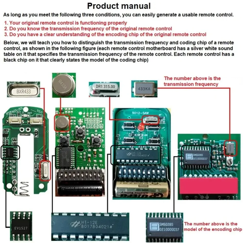 Compatible Chips: Pt2262, Pt2240, Pt2264, Pt2260, Pt2242, Sc2262, Sc2260, Ev1527, P527, Ht600, Ht640, Ht12d, Ht12f, Ht12e, Sc5262, Etc.