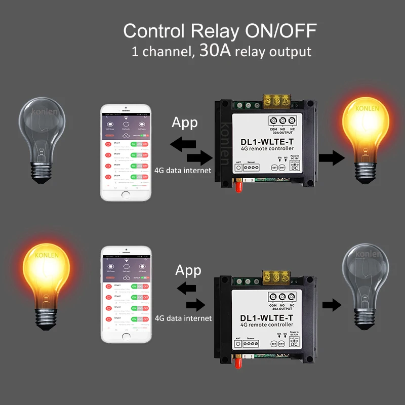 2. With one 30A relay ouput, It can control all kinds of high power equipments on/off by SMS/Call or via App (WLTE Control) remotely. The App communicates with controller via 4G data internet acess.