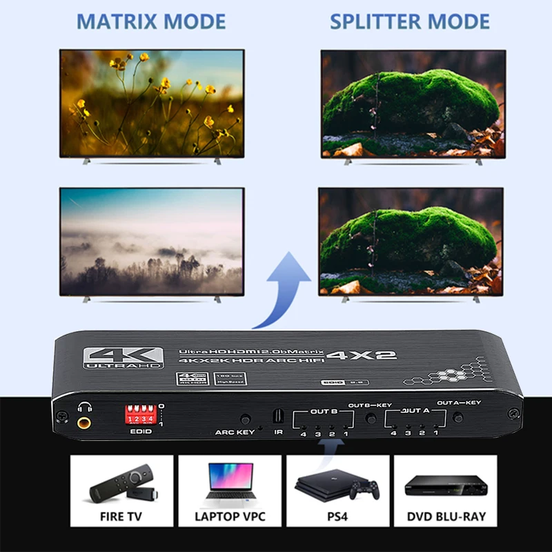 It supports video resolutions up to 4K@60Hz . It can extract the audio from the output A and send it to the digital optical S/PDIF and stereo analog audio outputs.