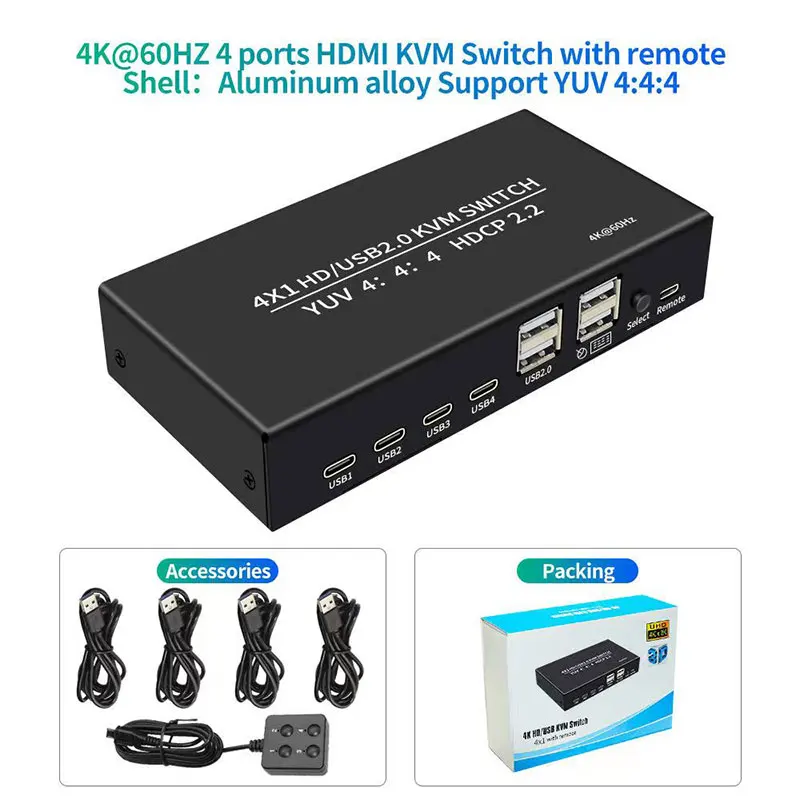 1. 4 Port– Used to share 4 USB or for HDMI-compatible peripheral devices(like scanner, USB hard drive or other USB devices) without having to constantly change cables. (Using only 1 set of keyboard, mouse and monitor to control 4 PCs)
