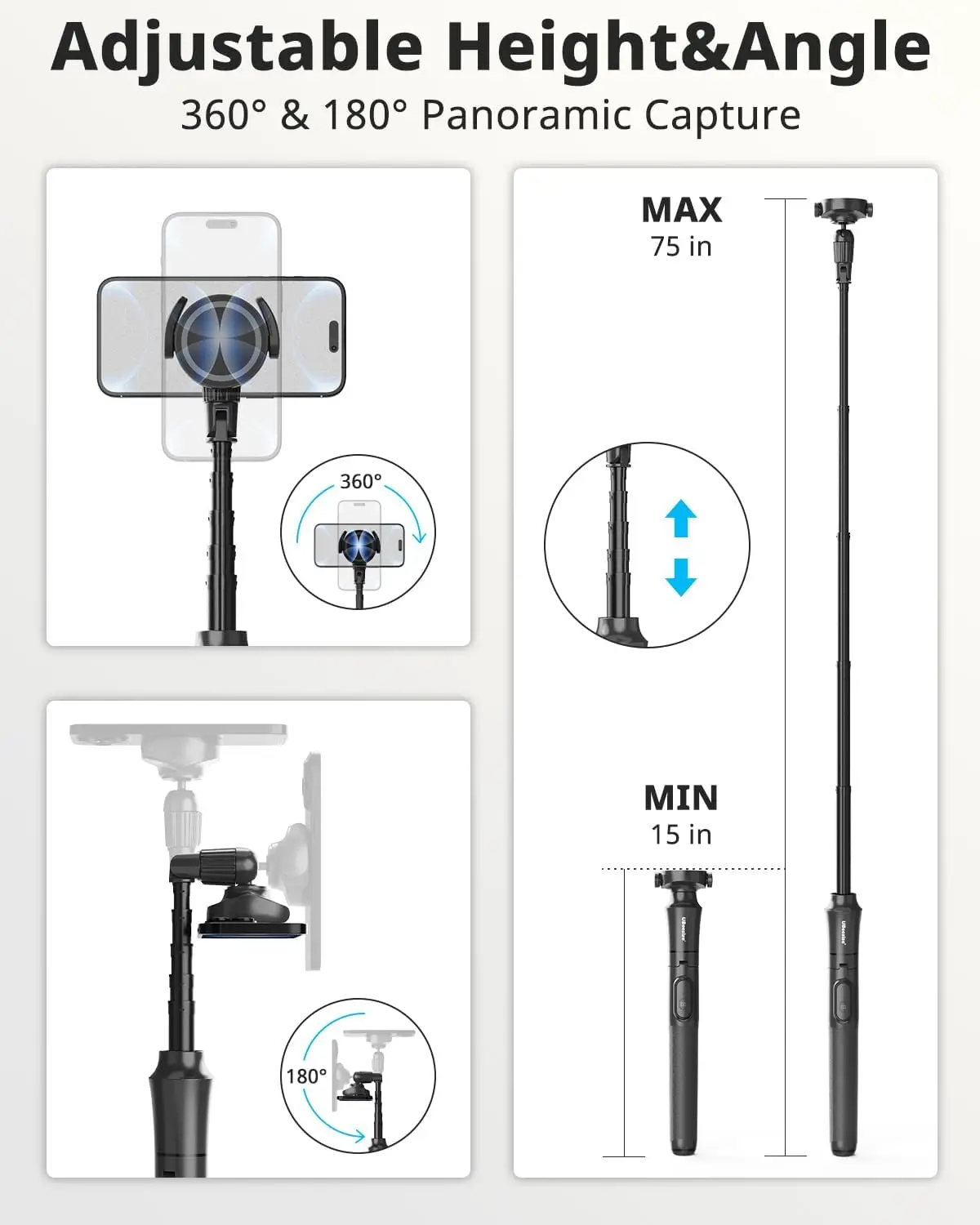 Elevate your photography and videography experience with our versatile magnetic tripod stand. Designed for modern smartphones, this product offers a perfect blend of functionality and convenience to help you capture stunning shots effortlessly. Key Features: 1. Strong Magnetic Attachment: Equipped with a powerful magnet that securely holds your phone in place, compatible with MagSafe-enabled devices and other phones using included adapters. This ensures stable positioning for clear photos and videos without the risk of slipping. 2. Extendable Height up to 72 Inches: Adjust the tripod from a compact size to a full height of 72 inches (over 6 feet), providing flexibility for various shooting scenarios such as group selfies, vlogging, or hands-free video calls. 3. Included Remote Control: Comes with a wireless remote that allows you to take photos or start/stop recordings from a distance, making it ideal for solo content creators or family gatherings where you want everyone in the frame. 4. Wide Compatibility: Works seamlessly with iPhone 15, 14, 13, 12, and 11 series as well as most Android smartphones. The universal design ensures it fits multiple devices without needing extra accessories. 5. Durable and Portable Construction: Made from high-quality materials that offer stability on different surfaces while being lightweight enough to carry in your bag for travel or outdoor adventures. 6. Easy Setup and Adjustment: Features quick-release mechanisms and adjustable legs for fast deployment on uneven ground, saving you time during shoots. 7. Versatile Use Cases: Perfect for live streaming, video conferencing, time-lapse photography, or simply propping up your phone for hands-free viewing—enhancing productivity and entertainment. Why Choose Our Tripod? This stand combines innovation with practicality to meet the needs of both amateur photographers and professionals looking for reliable support tools at an affordable price point.
