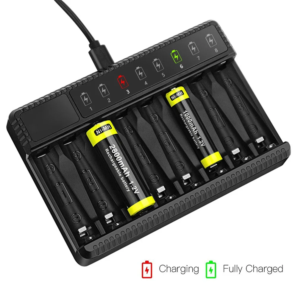It is suitable for nickel metal hydride battery charging, eight card slot independent control. It can hold up to four No. 5 and No. 7 batteries, or a mix of them.