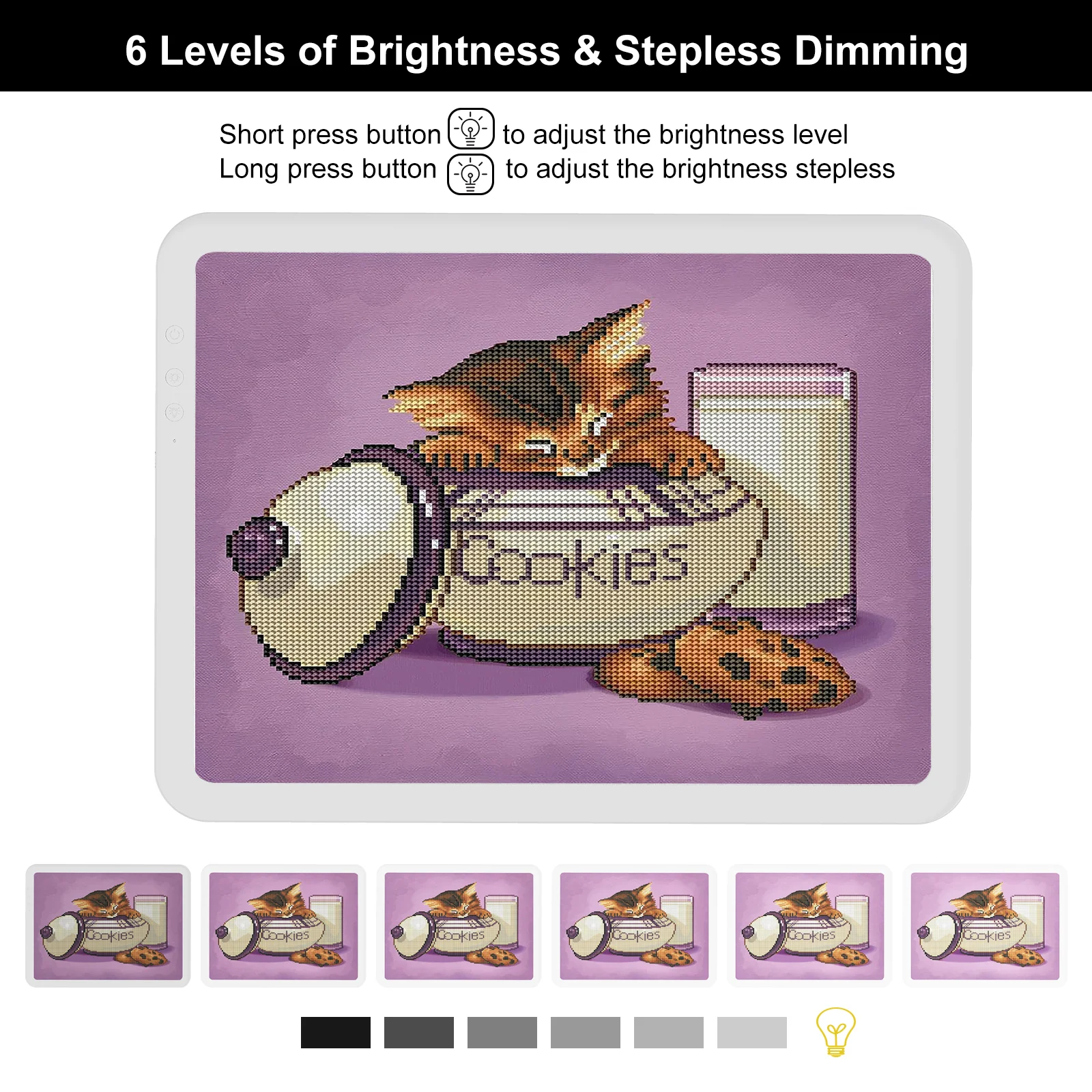 8000Lux Super bright,6-Level/Stepless Adjustable Brightness:By briefly pressing the physical button you can select 6 brightness levels (2100/3360/4650/5870/6990/8120Lux) OR by long pressing the physical button you can adjust the brightness steplessly adjust(2100~8120 Lux).The maximum brightness of Drawing Lightbox reaches 8120Lux on the surface, which is a great tool for Drawing, art supplies, drawing supplies.