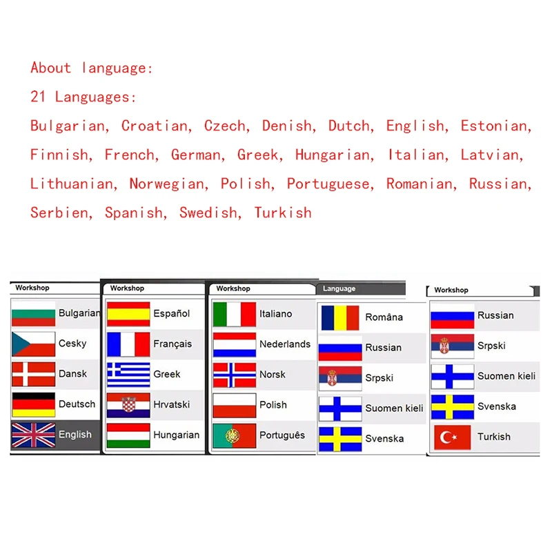 Polish, Portuguese, Romanian, Russian, Serbien, Spanish, Swedish,