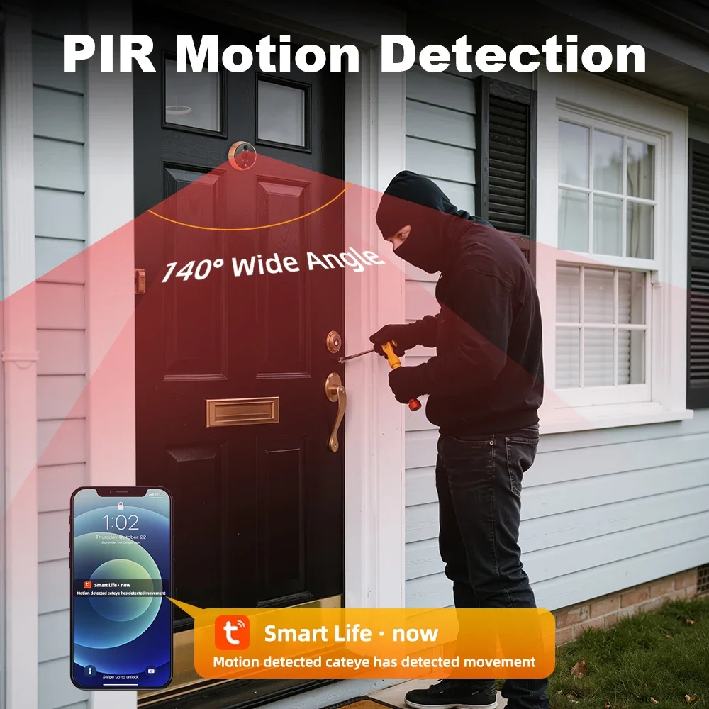 4.PIR motion detection, 140° viewing Angle. When the doorbell detects movement, the APP will push a notification.