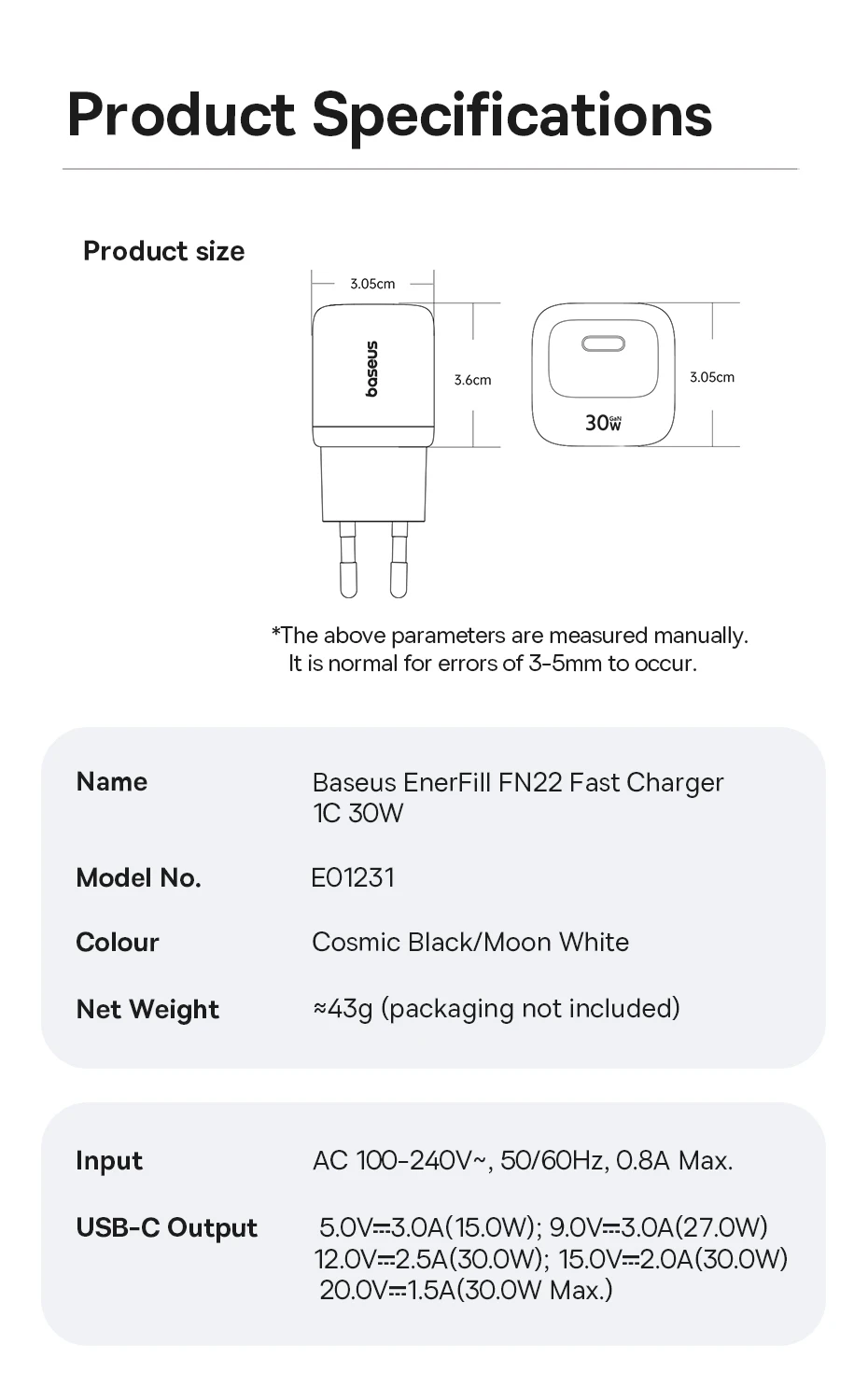 Type-c Output :5V/3A ( 15W ),9V/3A ( 27W ),12V/2.5A ( 30W ),15V/2A ( 30W ),20V/1.5A ( 30W ) Max.