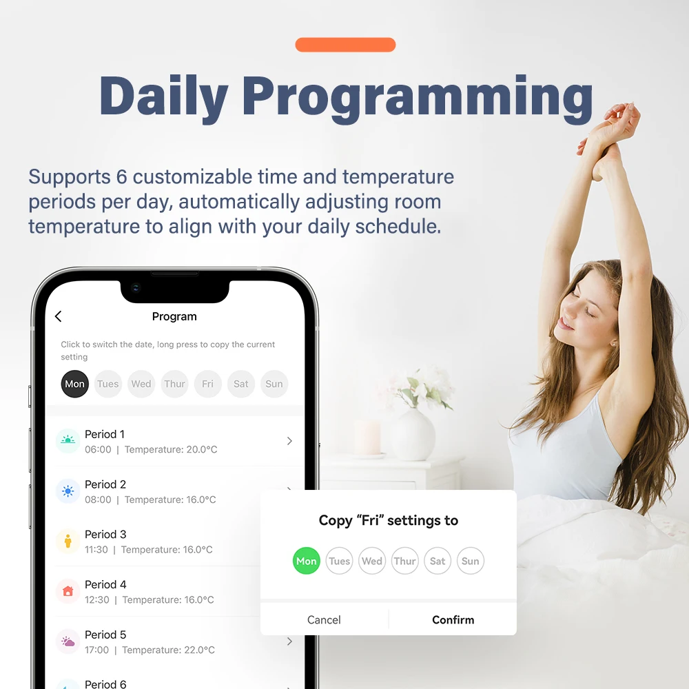 3.“Wifi” thermostat supports mobile phone remote control and voice control functions;