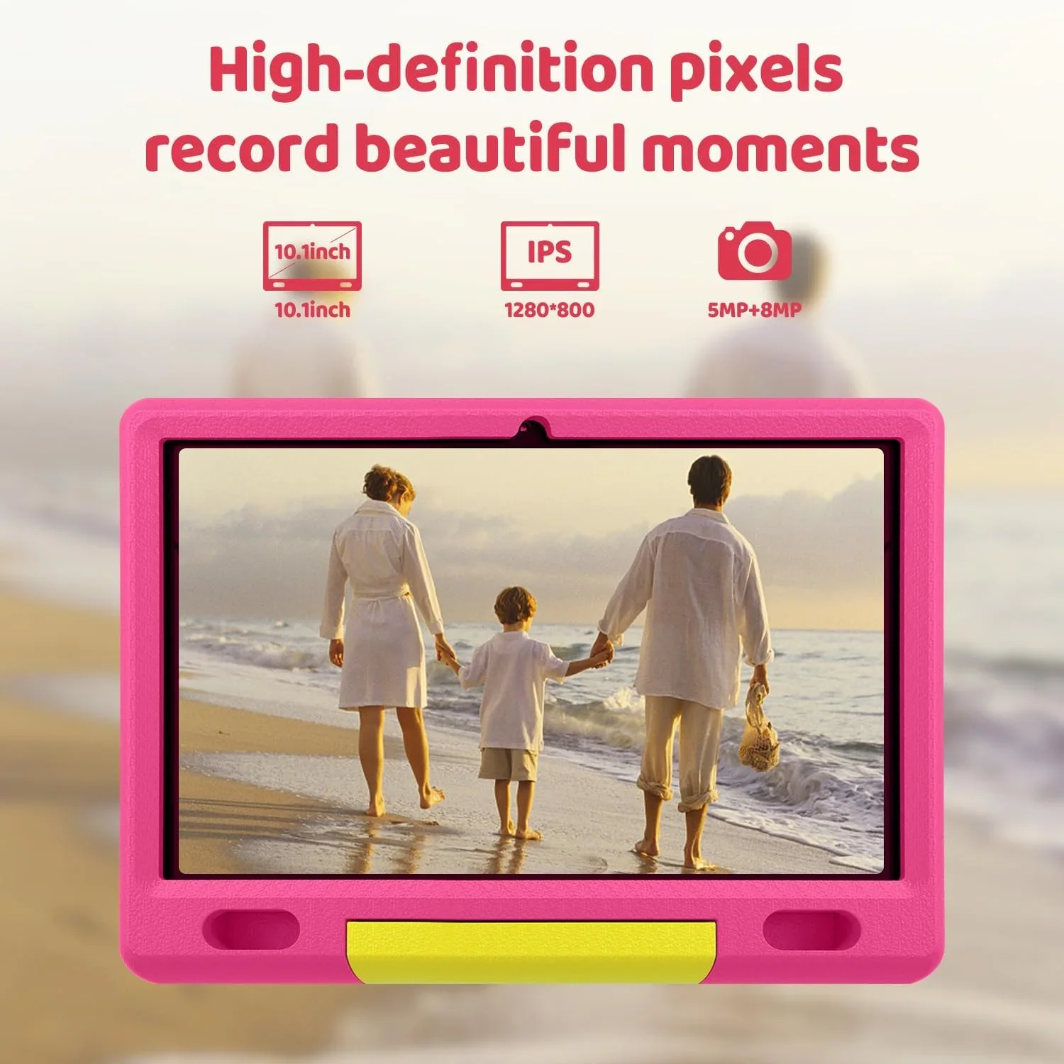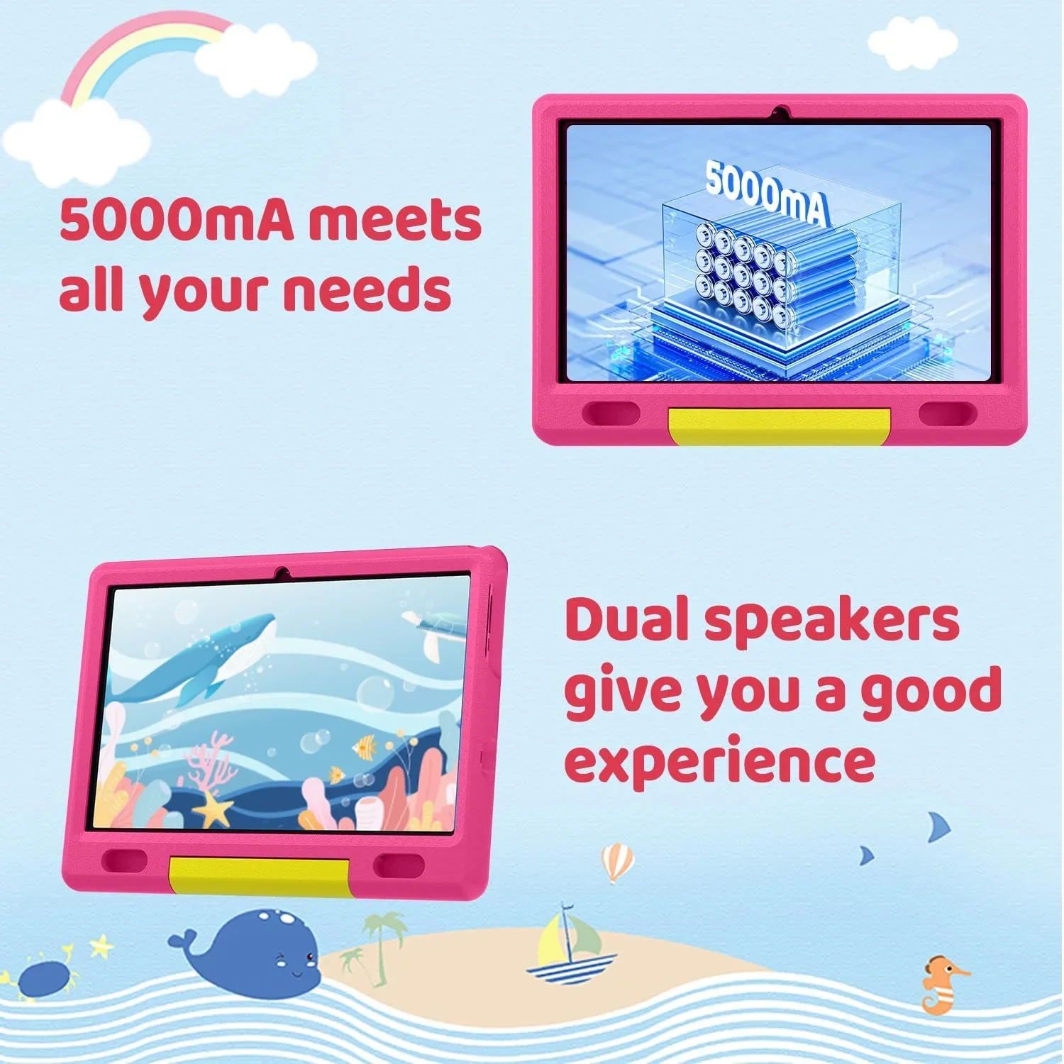 【 Multifunctional Android Tablet for Kids 】This 10-inch tablet for kids comes with 1280×800 IPS HD touch screen,Android 13.0 system, 1.6 GHz quad-core processor,With 64GB of storage space, you can store more suitable cartoons, videos, educational games, e-books and so on.The 5000mAh battery provides enough time for kids to read and watch TV videos.