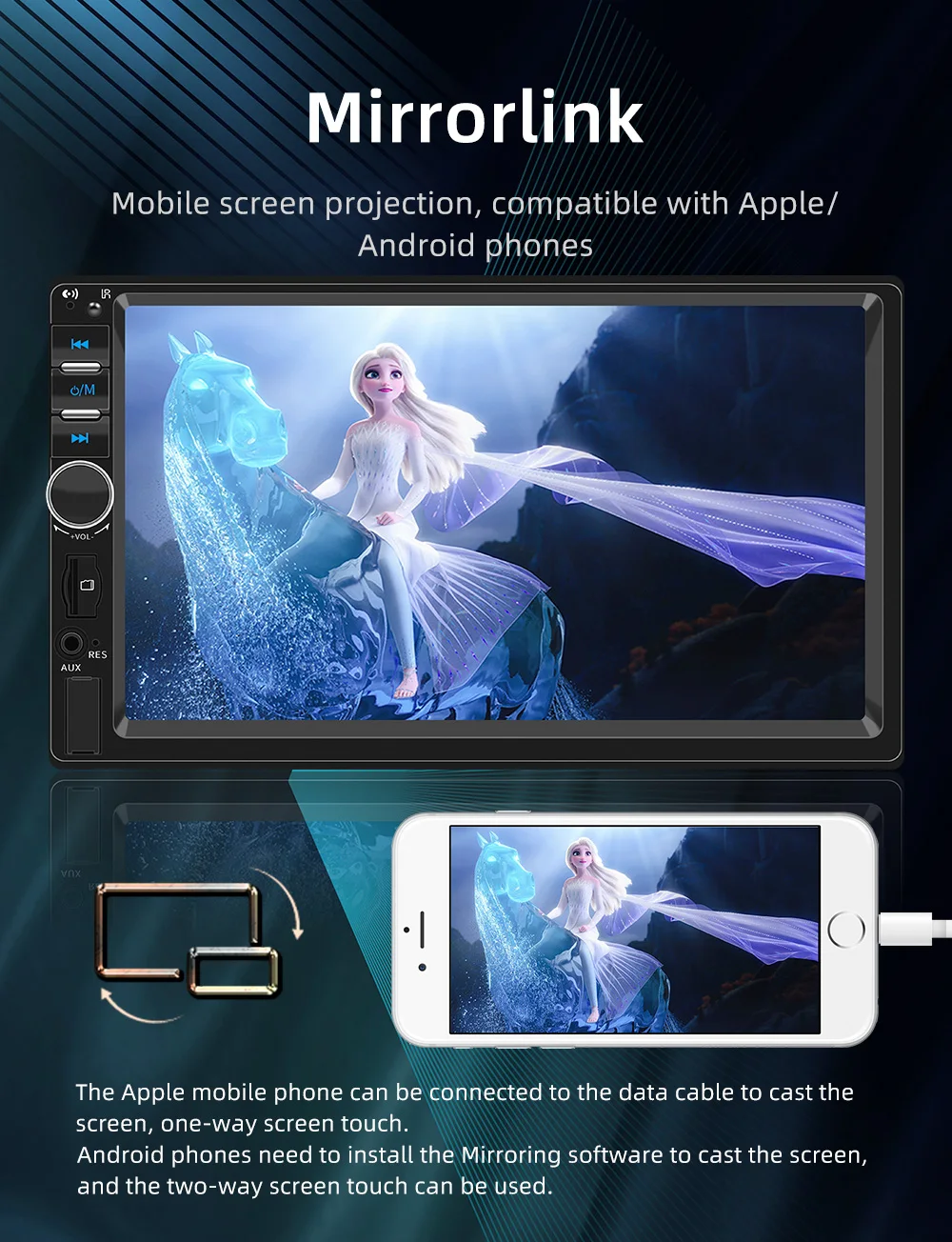 Support Mobile phone interconnection: Mirror-Link allows to synchronize mobile phone screen in the car via connecting them with USB cable.As it is very strict with the data cable.Please use the original phone USB cable.
