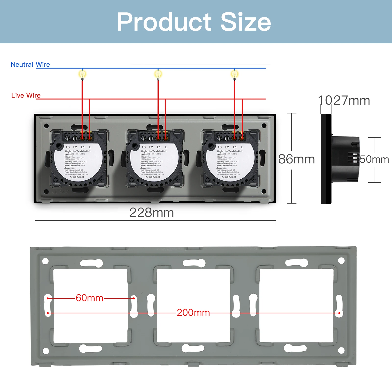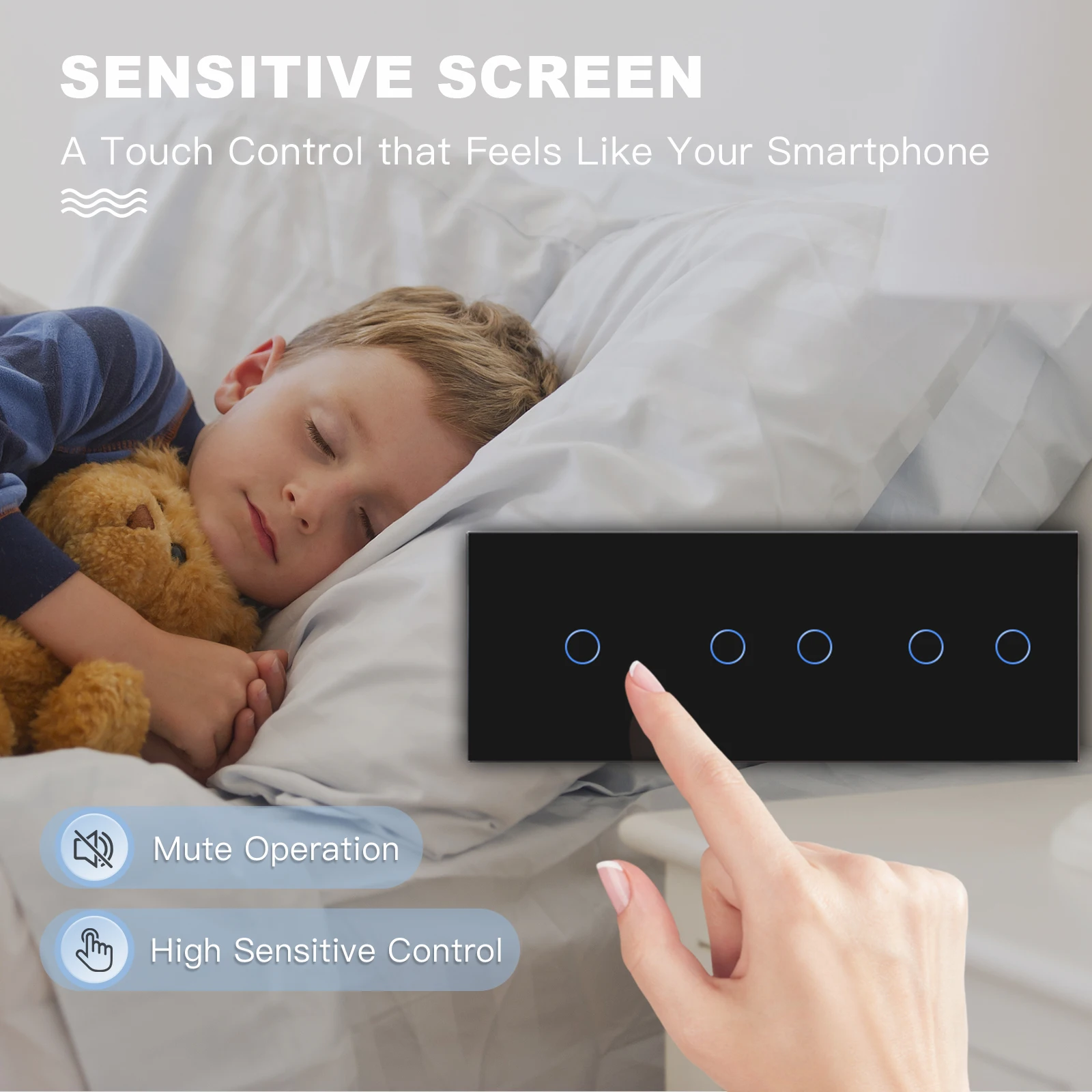 BSEED Touch Switches 1/2/3Gang 1Way Wall Light Switches Blue LED Backlight Glass Sensor Screen Home Switches Black EU Standard
