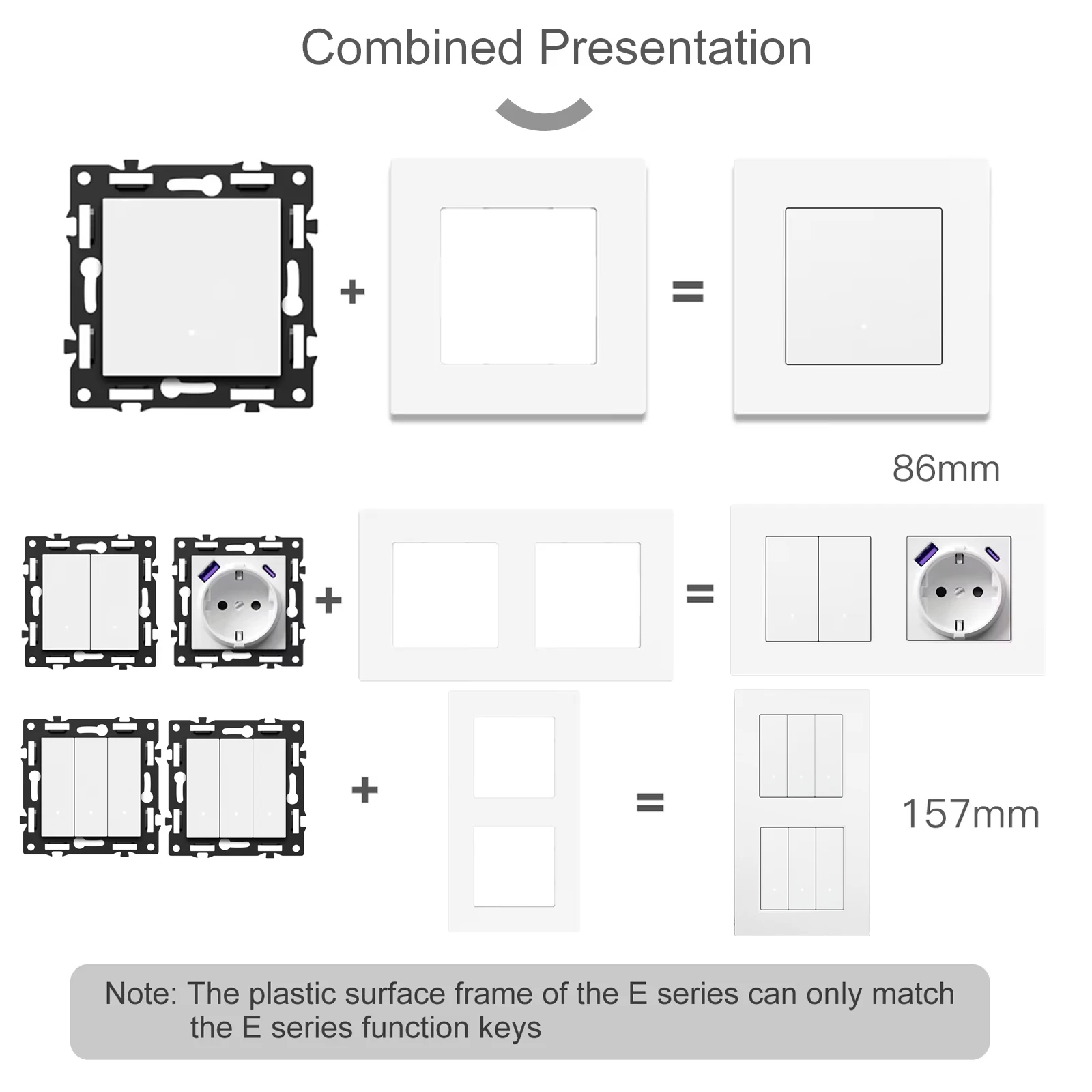 A:Since the E-series function keys and the iron middle plate are integrated, it is not suitable for using with other BSEED frames or Panels.