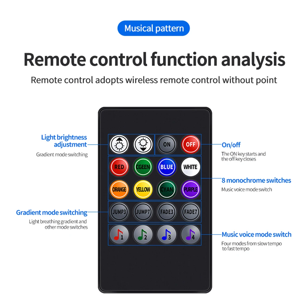 6) Control mode: 4 Music control mode, 8 signal color control, brightness control, ON/OFF, 2-segment jump mode control, fade-in and fade-out mode control.