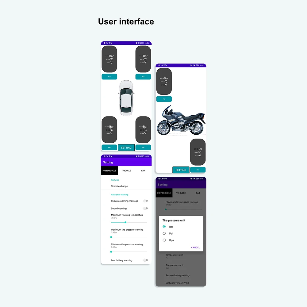 1. High Quality: The tyre pressure sensor is made of ABS+Copper material, impact resistance, heat resistance, low temperature resistance, chemical resistance, excellent electrical performance. 2. Bluetooth-compatible APP Tire Pressure Monitor: Connect mobile phone Bluetooth-compatible, monitor tire pressure, APP set high, low pressure and high temperature alarm values. 3. Data Display: The tire pressure monitoring system can display real-time tire pressure data, the tire pressure change is immediately known, and the tire pressure of four tires is checked at the same time. 4. Alarm System: The tire pressure monitor has a reliable alert system, it will alert you when something abnormal happens. The mobile phone will alert you when the tire pressure is too high or too low, and alert you when there is an air leak. 5. Satisfaction Guarantee: We strive to provide each customer with the highest standard of customer service to ensure you have a pleasant shopping experience. If you have any issues, inquiries or need assistance, please feel free to contact us directly. Specification: Note: