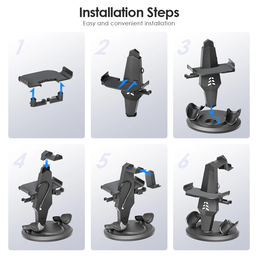 Safe and Stable: The vr display holder comes with a widened base and non-slip holes to prevent tipping, ensuring your VR setup is stored safely and neatly while remaining easily accessible. It offers compact storage and display for your VR system.The rotatable controller holder allows for easy switching between different types of controllers.