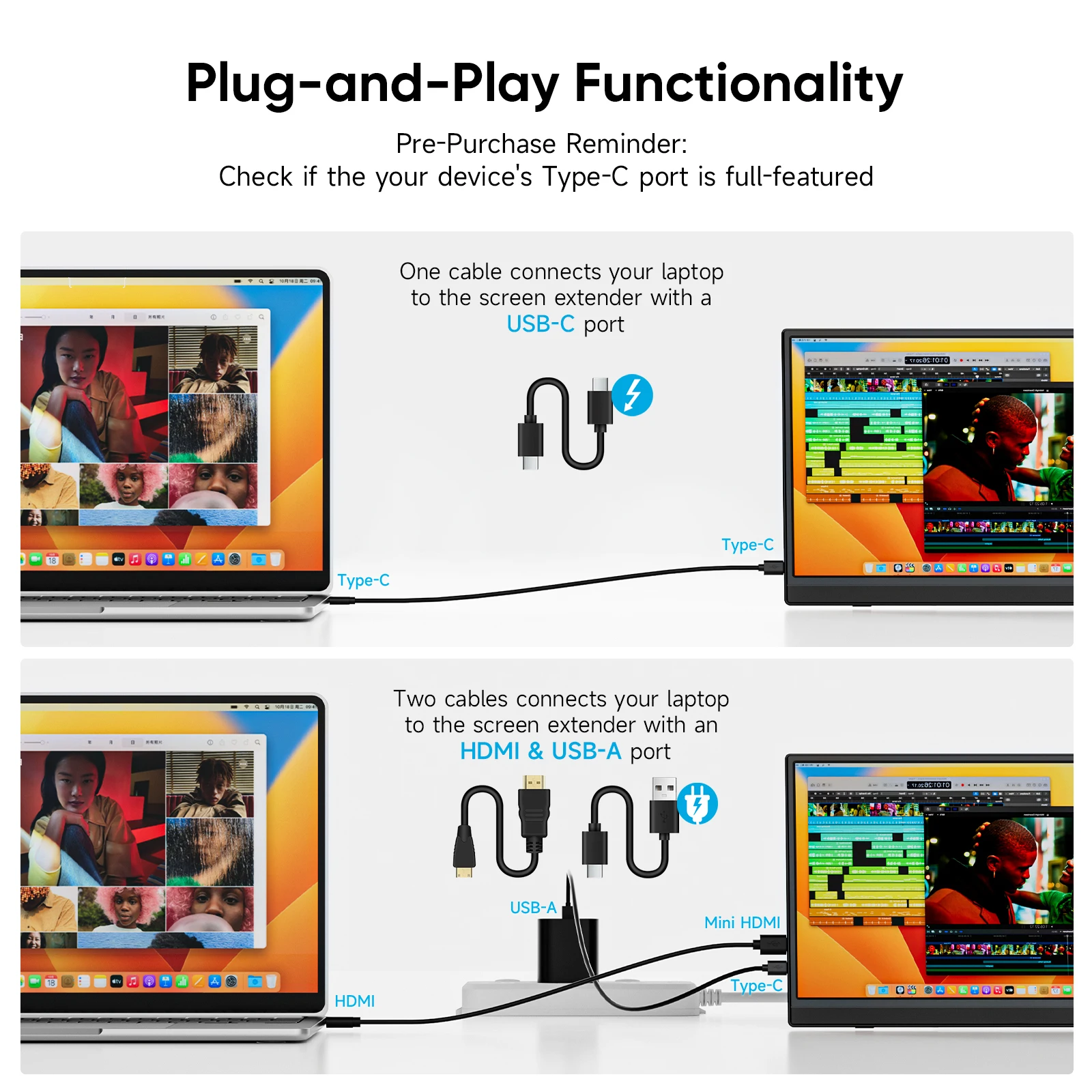 【Plug and Play Right Out of the Box】No complicated setup needed! This portable laptop monitor instantly connects as a second screen—plug it in and start using it. It works with most modern laptops via USB-C, so you’ll be ready to go in seconds. Note: Some laptops and phones without full-featured USB-C ports might need an extra USB-A to USB-C cable for power.