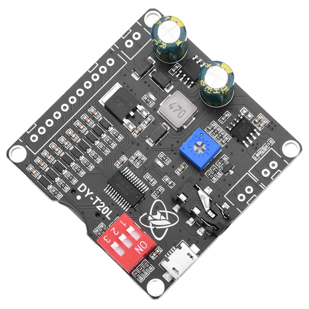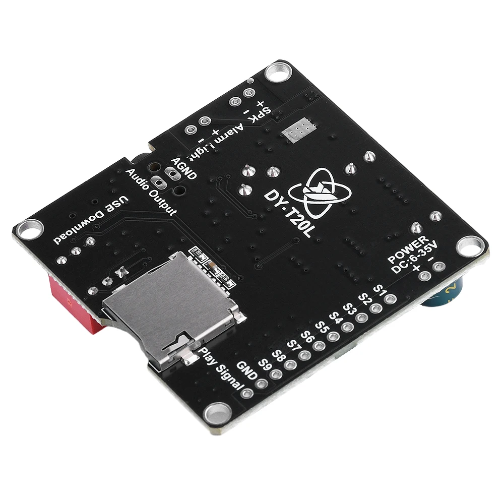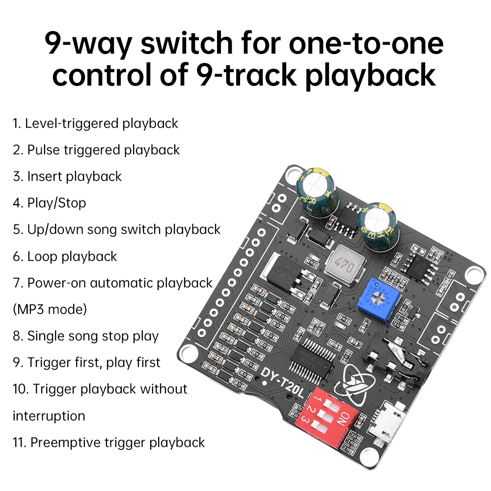 DY-T20L is a one-to-one segmented trigger control player; Low level signal triggering; Supports MP3 and WAV decoding formats; Can trigger 9 tracks in segments; 6-35VDC wide voltage power supply, direct drive 4-8 Ω speaker, maximum output power of 20W; Support TF card (memory card) up to 32GB, USB flash drive (maximum 32GB), and connect to the computer via USB data cable to replace audio files; Can adjust the volume size; Can be externally connected with warning lights; Multiple triggering working modes can be set, suitable for various scenario applications.