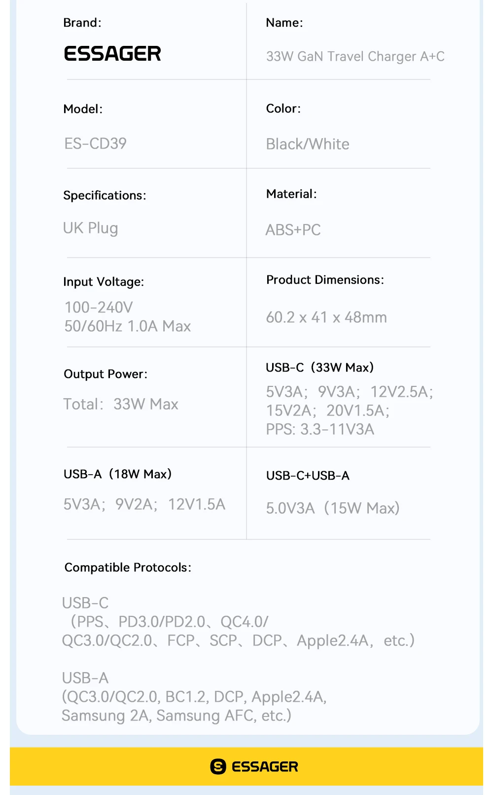USB-A: 5V⎓3A 9V⎓2A 12V⎓1.5A