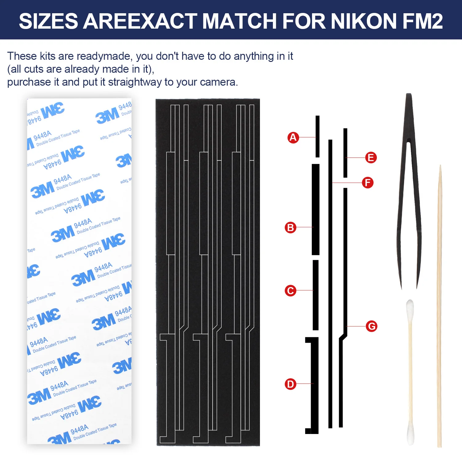Sizes are exact match for Nikon FE FM FE2 FM2 FM2N FM2T. These kits are readymade, you don’t have to do anything in it(all cuts are already made in it). Purchase it and put it straightway to your camera.