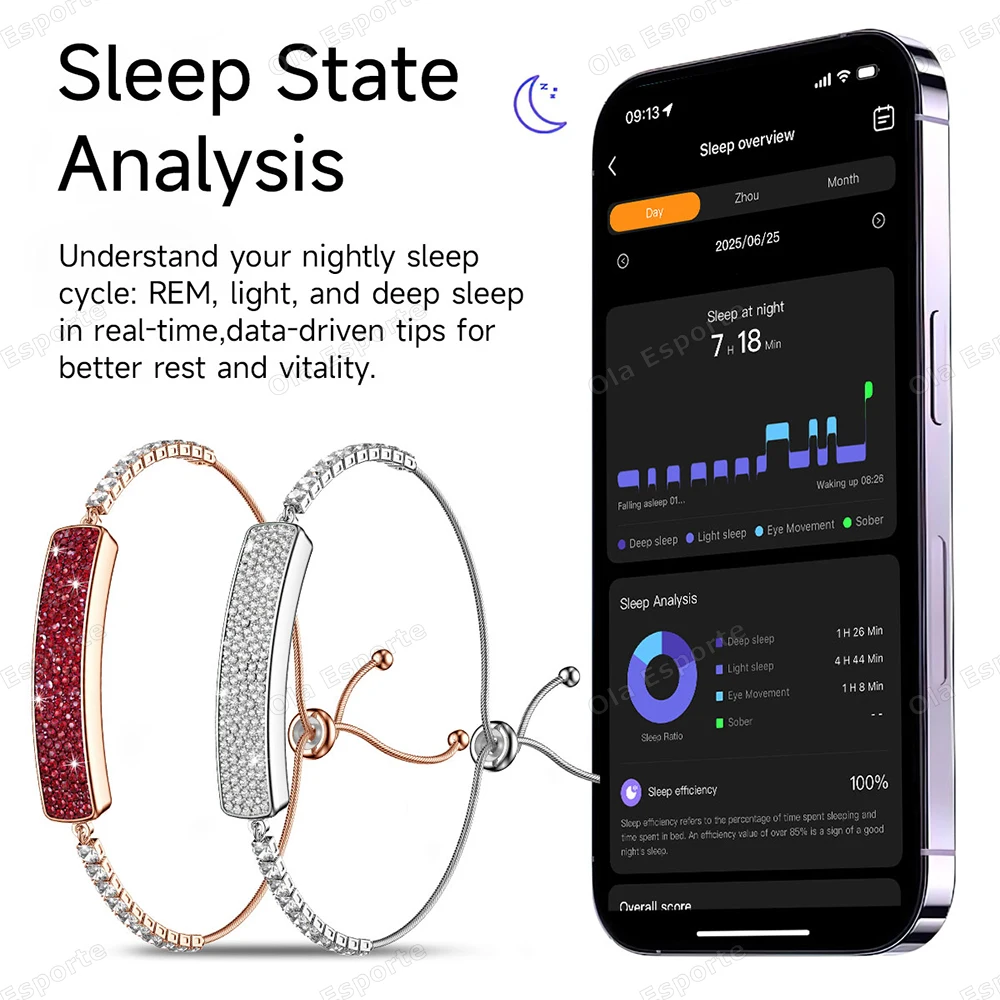 Monitoring of heart rate, monitoring of blood oxygen level, monitoring of stress, variability of heart rate, female physiological cycle, shaking and taking photos, multiple exercise modes, monitoring of sleep (sleep time, sleep quality), step counting, synchronization of data with APK/APP