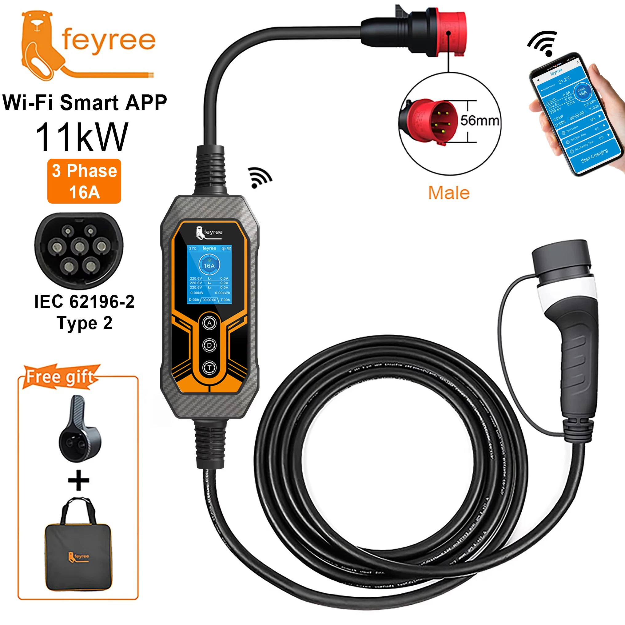 【CHARGING FASTER】: This EV charger can adjust the current of 8A/10A/13A/16A Amp, to reach a max output power up to 11KW. Making EV car charging faster! (Note: The actual charging time of an electric car comes down to the following two: the power source and the vehicle’s on board charger capacity.)