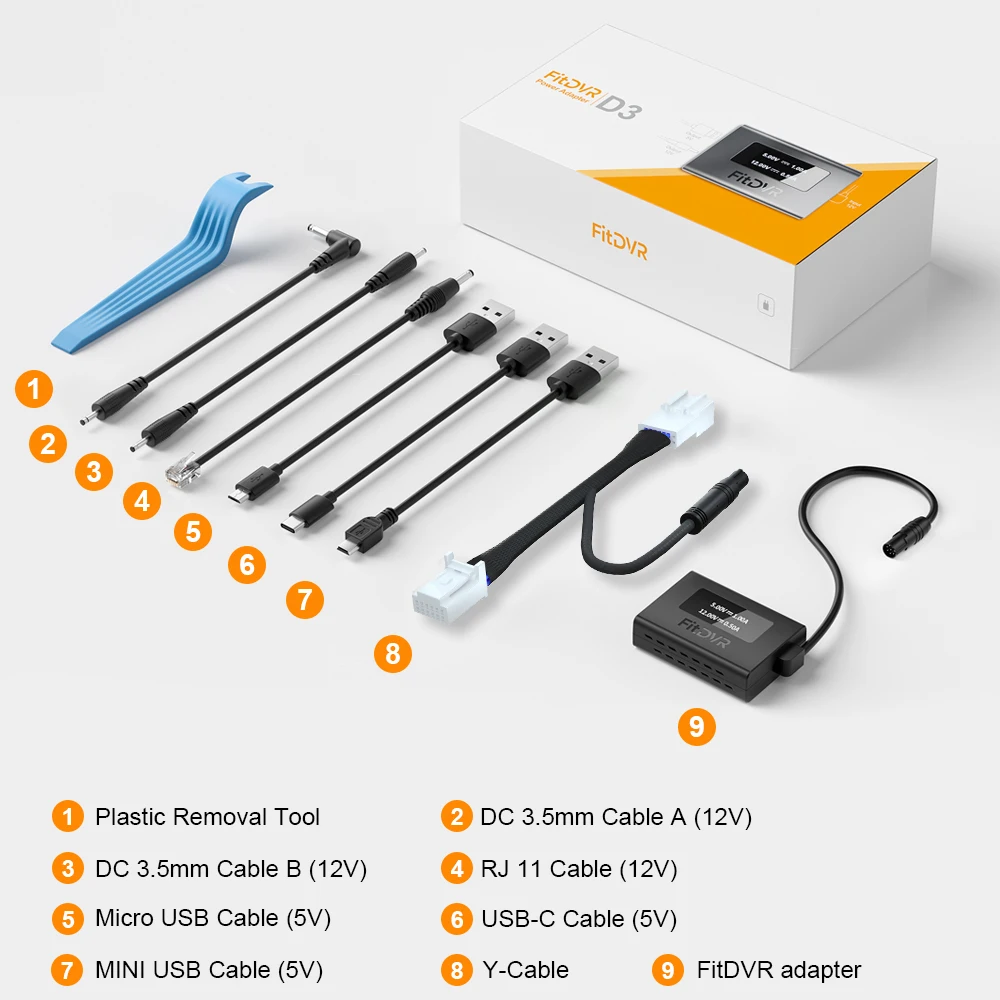 Includes Mini USB (5V), Micro USB (5V), USB-C (5V), and DC3.5mm (12V) cables.