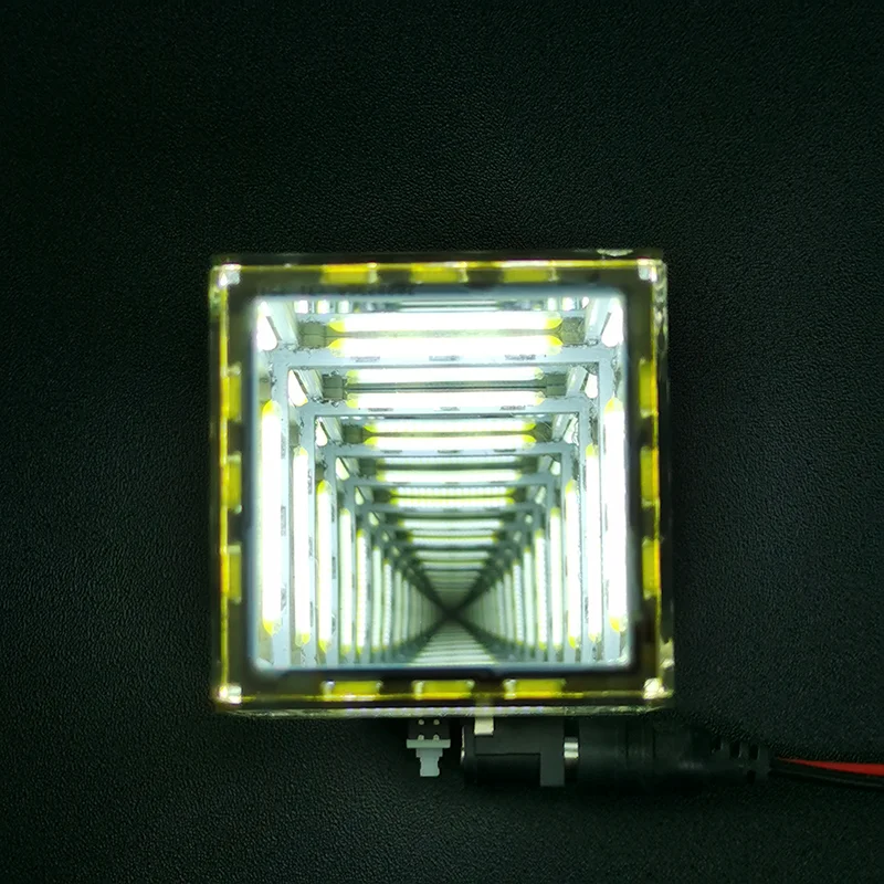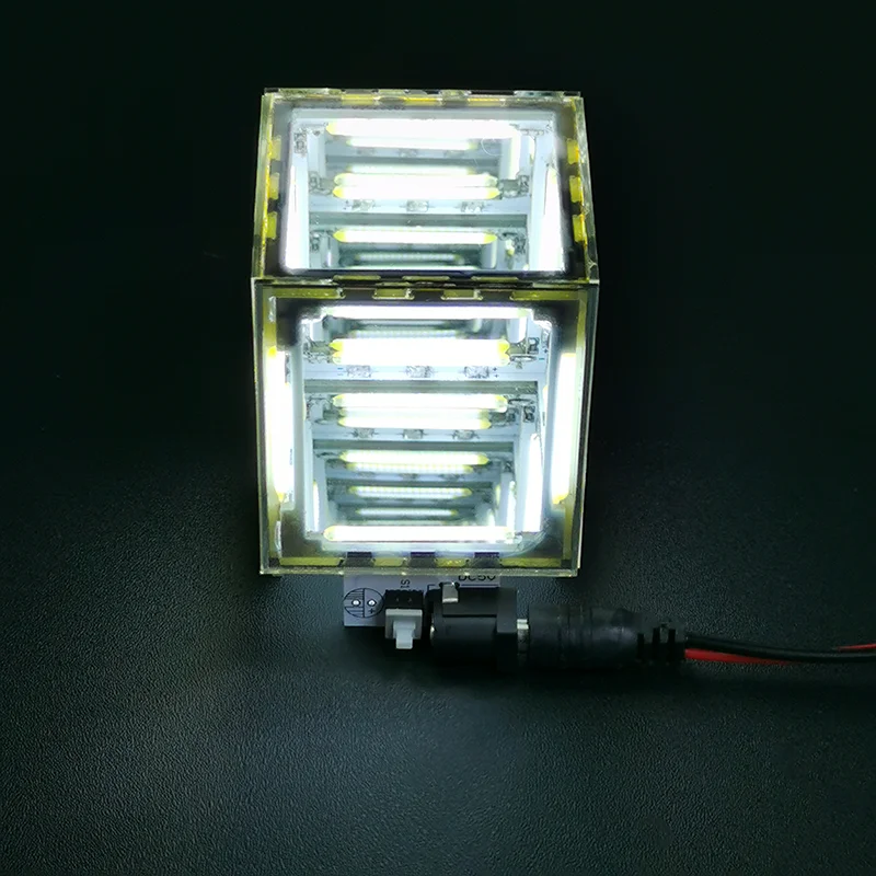 12. Attach the acrylic semi-transparent mirrors. The bottom acrylic semi-transparent mirror is 44.2*44.2mm, the top one is 47.5*47.5mm, the front and back are 57.6*47.5mm, and the left and right are 57.6*50mm. After determining the position of each acrylic semi-transparent mirror, peel off the blue protective film and glue the acrylic semi-transparent mirror to the PCB board.