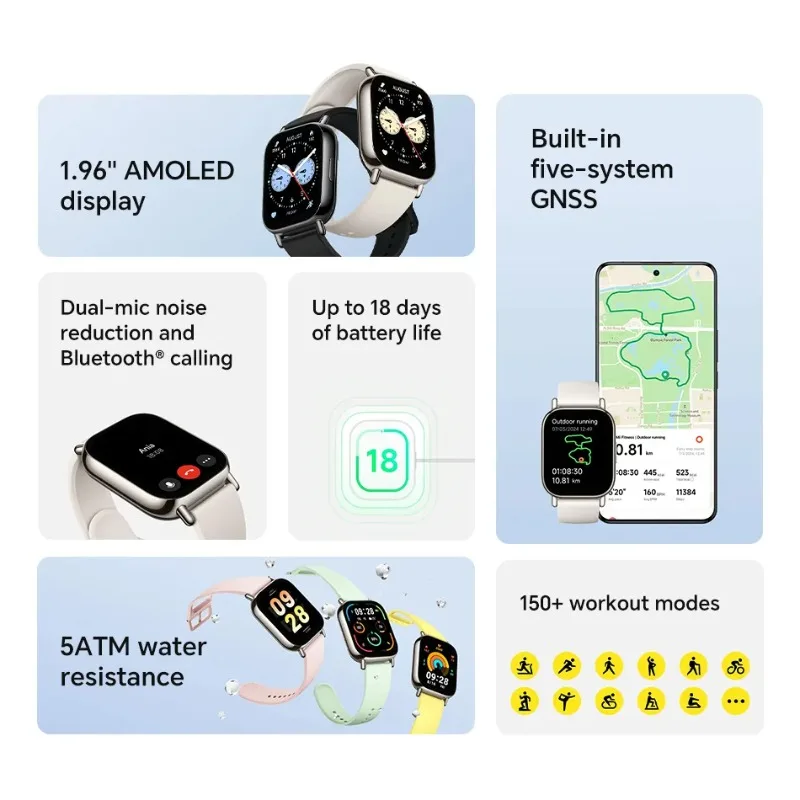 Key Features: Bluetooth calling, GNSS, sport tracking, 150+ sport modes, blood oxygen, heart rate, sleep &
