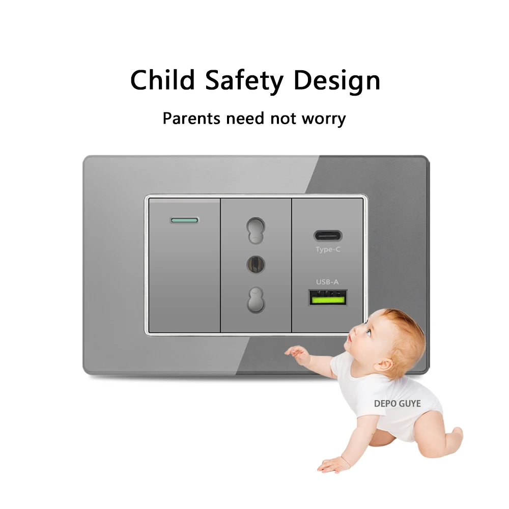 Grey Italy Chile USB Type C Smart Fast Charging Wall Socket Plugs Tempered Glass Schuko Light Switch Panel TV Sat Computer CAT6
