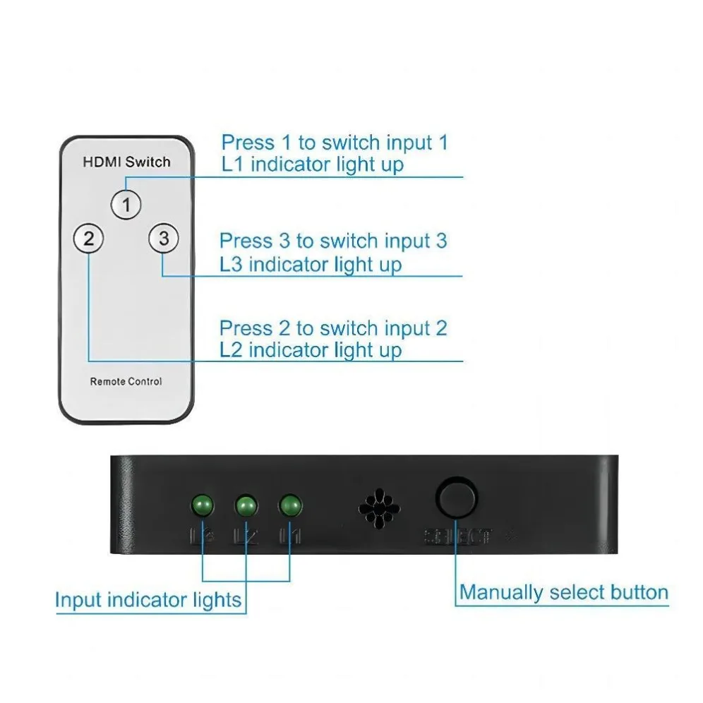 This 3×1 hdmi switcher can support 3 hdmi ports to be switched to all the way monitor terminals by remote control or manual buttons. This hdmi switcher can support all HD formats including 720p, 1080i, 1080p.