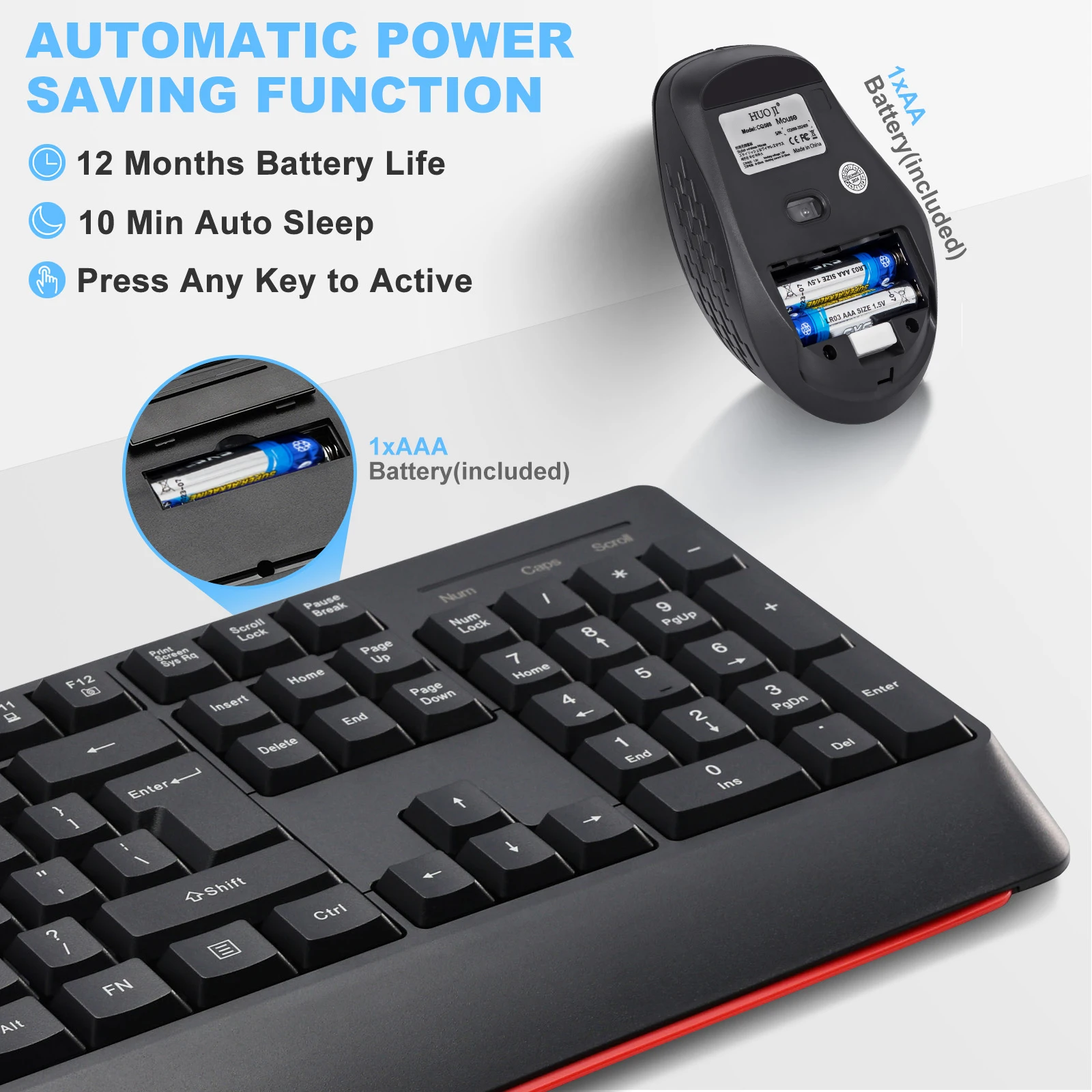 AUTOMATIC DEEP SLEEP AND ENERGY SAVING – The mouse and keyboard have an automatic suspension function. When you stop using them for more than 10 minutes, they will enter a suspension mode to save energy. You can click on any button to activate them. The battery life lasts up to 12 months. The keyboard uses one AAA battery, and the wireless mouse uses one AA battery (batteries included).