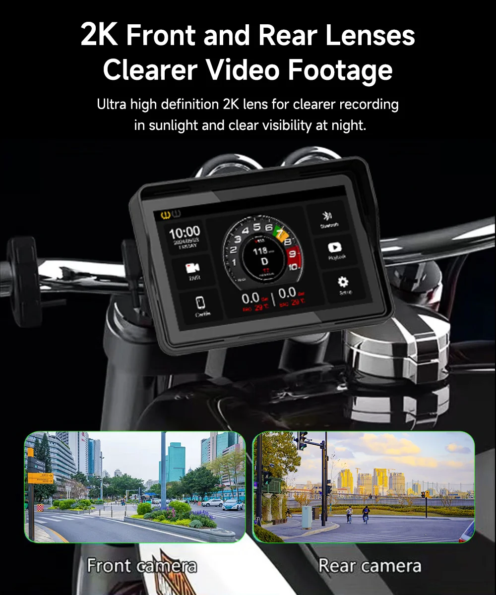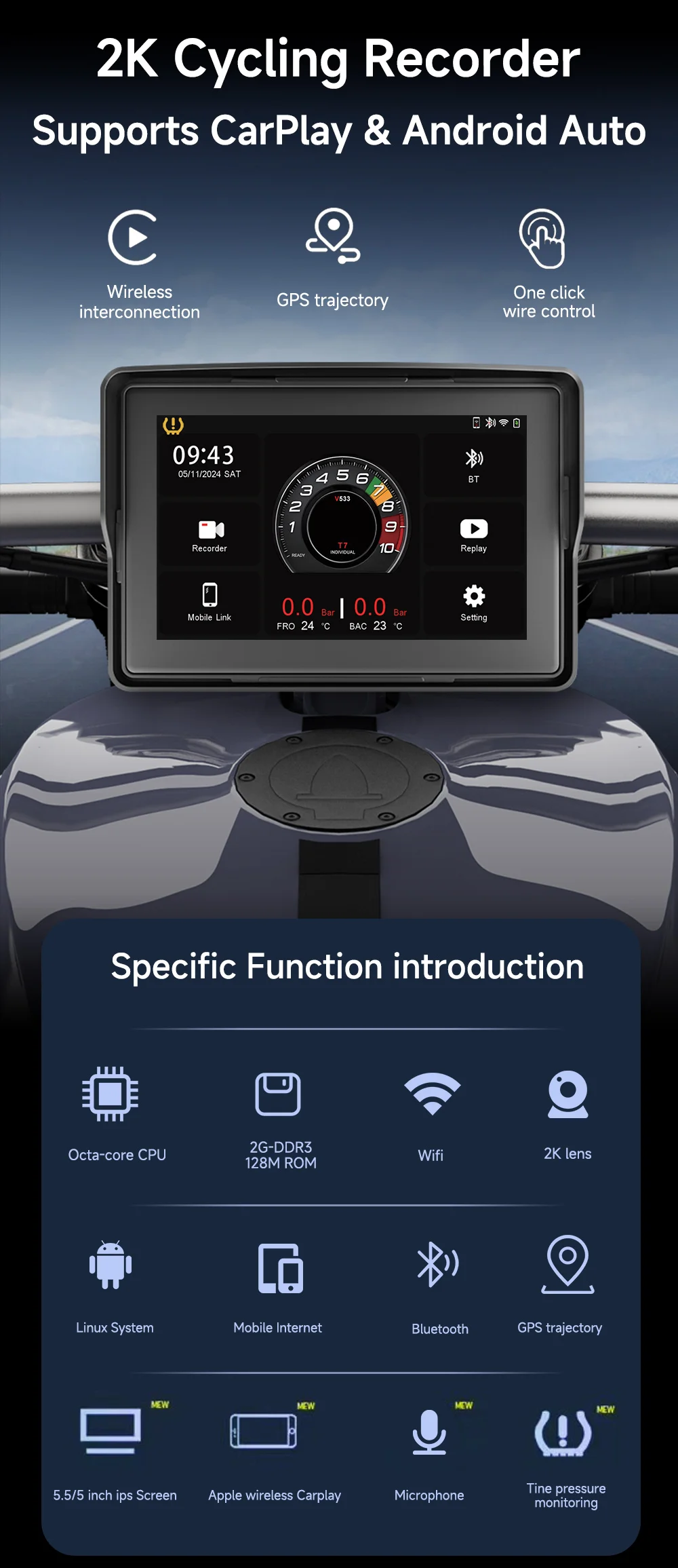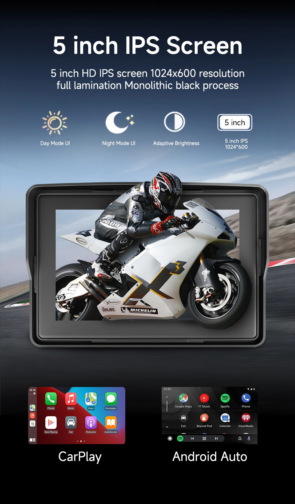 5Â Inch Motorcycle DVR GPS Navigation Multimedia Player Wireless CarPlay Android Auto IPX8 Waterproof Screen Recorder
