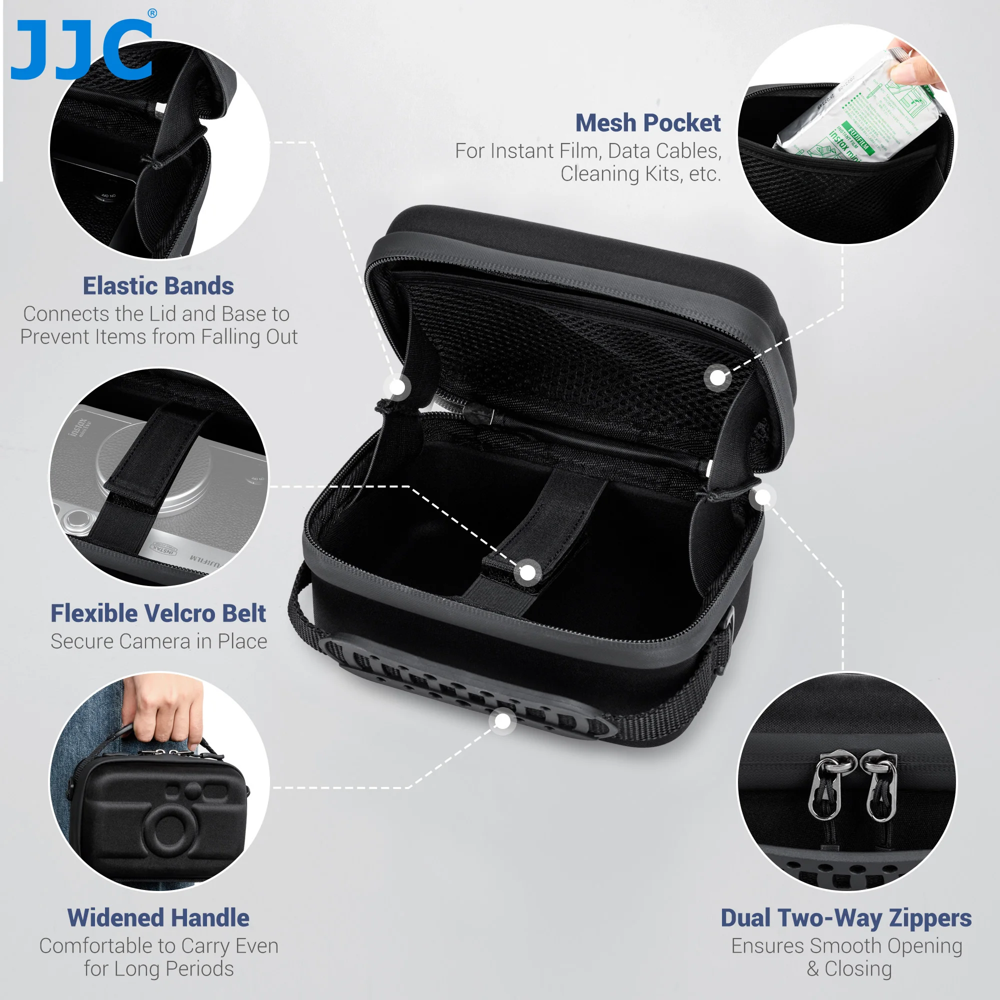 3. Mesh pocket in the top lid for storing accessories like film, cleaning sticks, and charging cables
