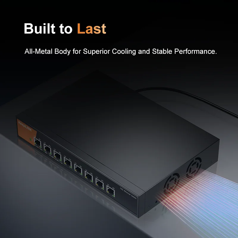 The KeepLink 8-port Multi-Gigabit unmanaged Switch, KP-9000-8XT-AC, helps businesses cost effectively expand their networks with multi-gig speeds. The KP-9000-8XT-AC Multi-Gigabit Ethernet switch comes with eight (8) 10G Ethernet port in a metal case and can be placed on a desk or mounted on a wall with the included wall-mount kit. This switch is energy efficient, built to last, and rigorously tested to provide the reliability businesses need. 802.1p traffic prioritization and jumbo frame support allow for seamless integration with more sophisticated networks.
