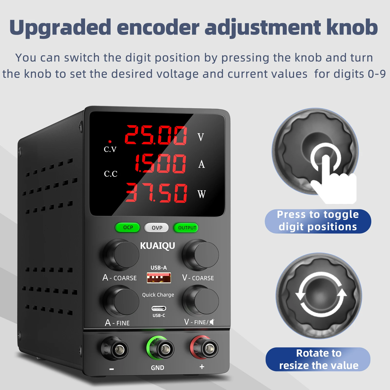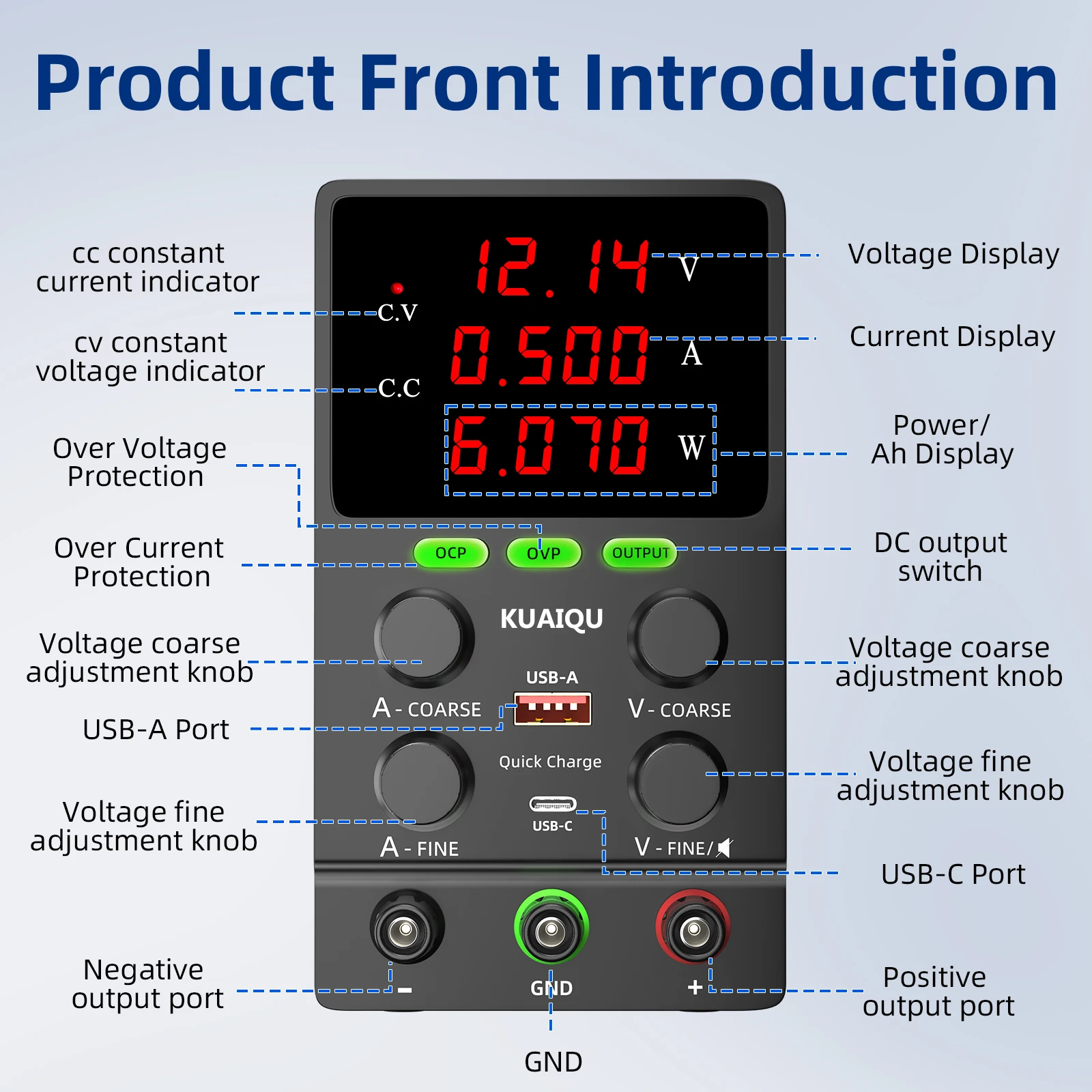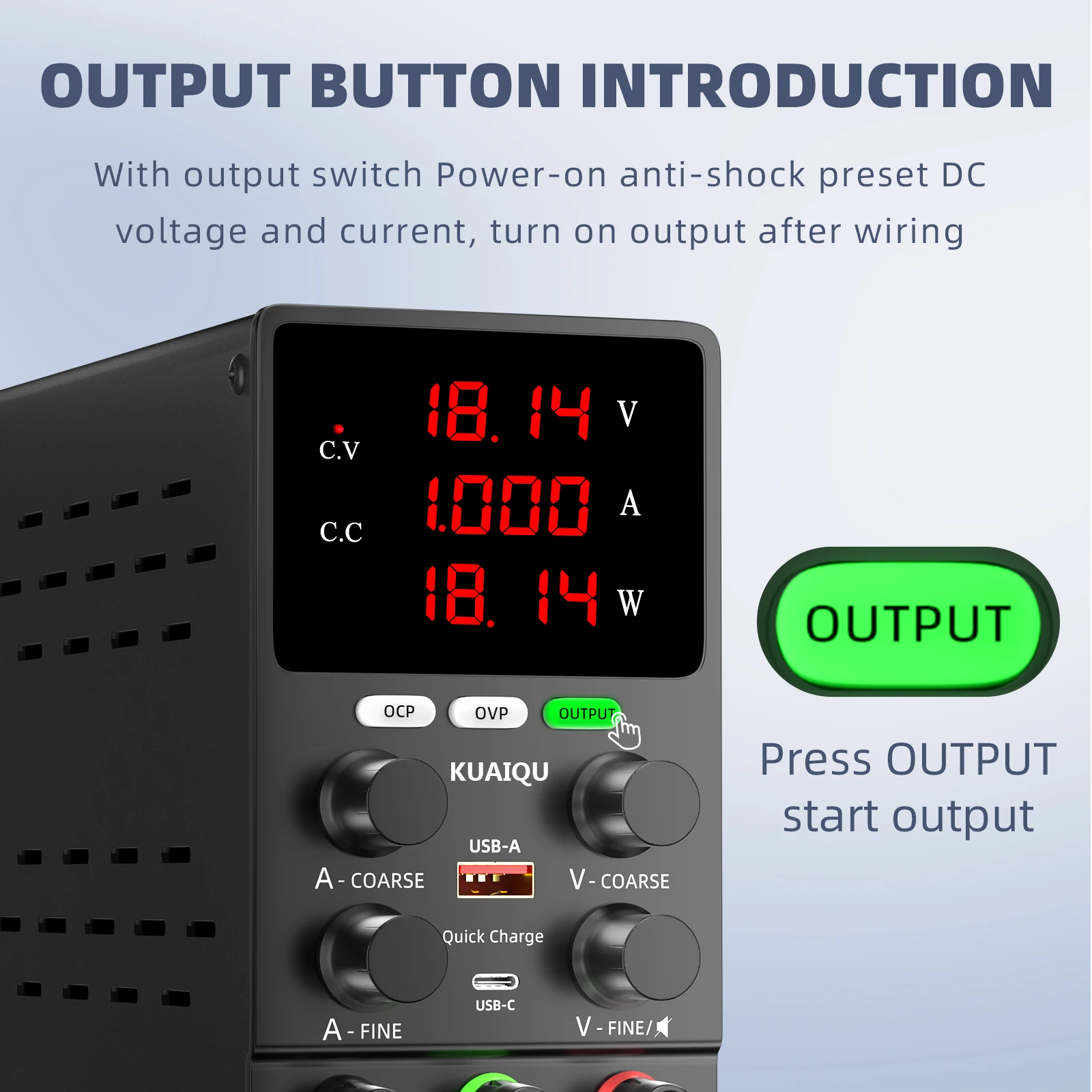 🔥【High Precision, Low Ripple, Big LED Display, Output Switch Control】KUAIQU DC power supply is a professional power supply regulator with high accuracy of 0.01V and 0.001A, low ripple of DC power supply. The backlit 4-digits LED display has the advantage of high resolution, which can be easily viewed even if you are in low-light conditions . Adjust the required voltage and current through the output switch button without the actual output power, safer and more energy efficient.