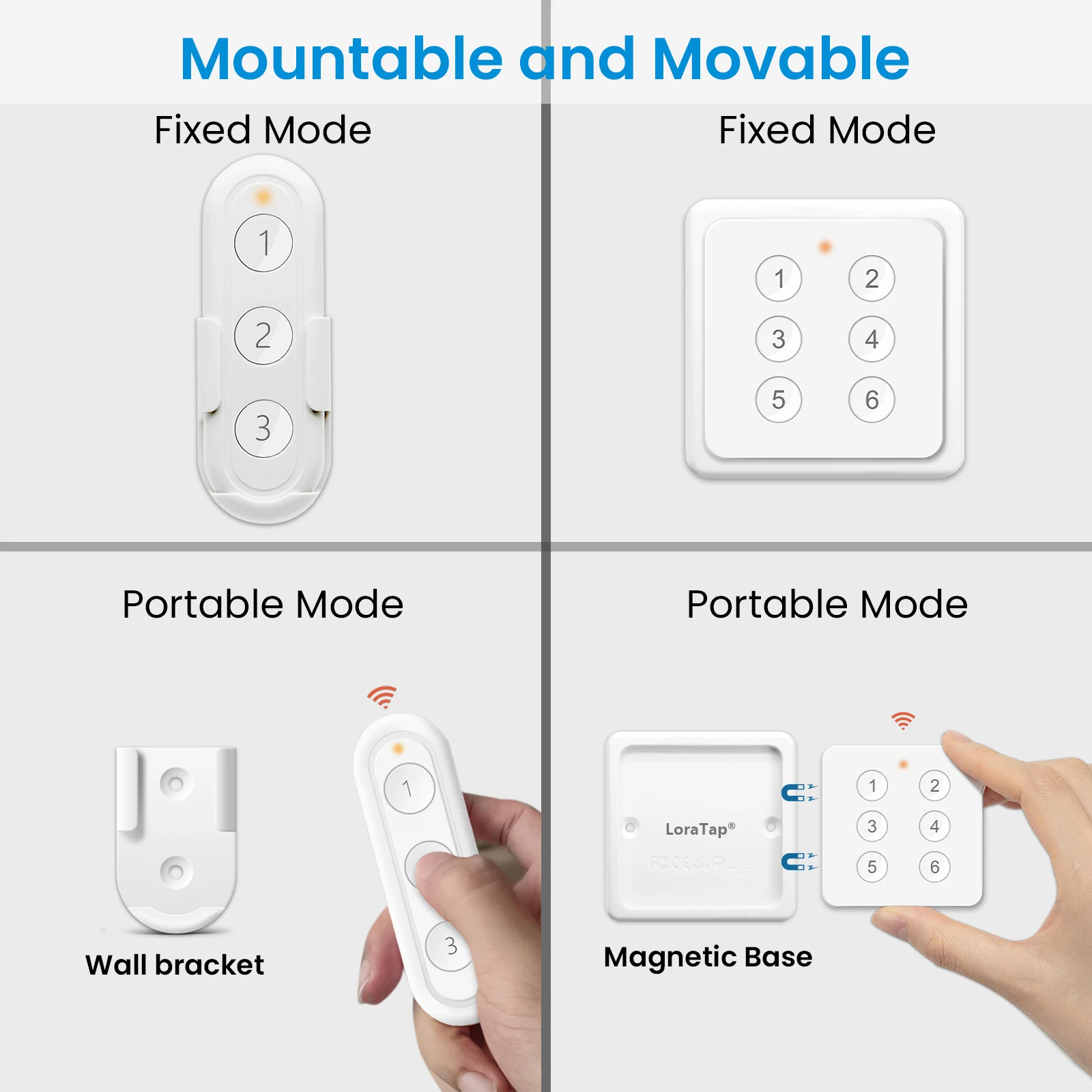 – The wall bracket is magnetic, the remote control can be attached to the bracket and used like a traditional switch, or it can be used as a remote control in your hand.