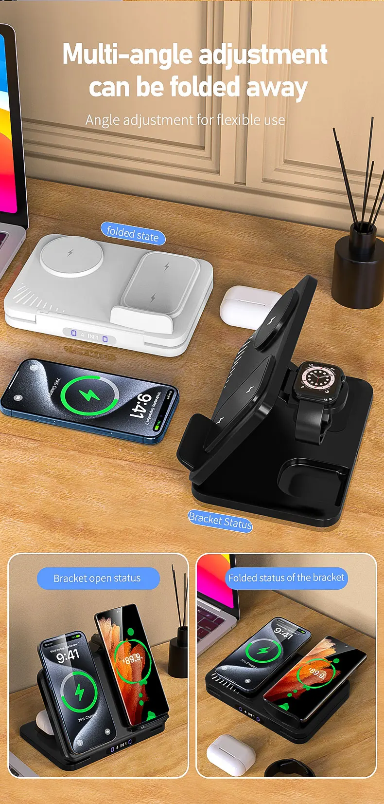 【Dual Phone Charging Station】: 2026 4 in 1 Dual Phone Charger for iPhone, Apple watch and AirPods at the same time. It is a wireless phone charging station, an Apple watch charger, and also an airpods charger station. This all-in-one charging solution keeps your devices powered and organized, making it perfect for home, office, or travel use. It is a must-have device for Apple fans. Say goodbye to endless cables and separate chargers.(for iPhone, Apple watch, other phones with wireless charging function.and earphones support wireless charging.)