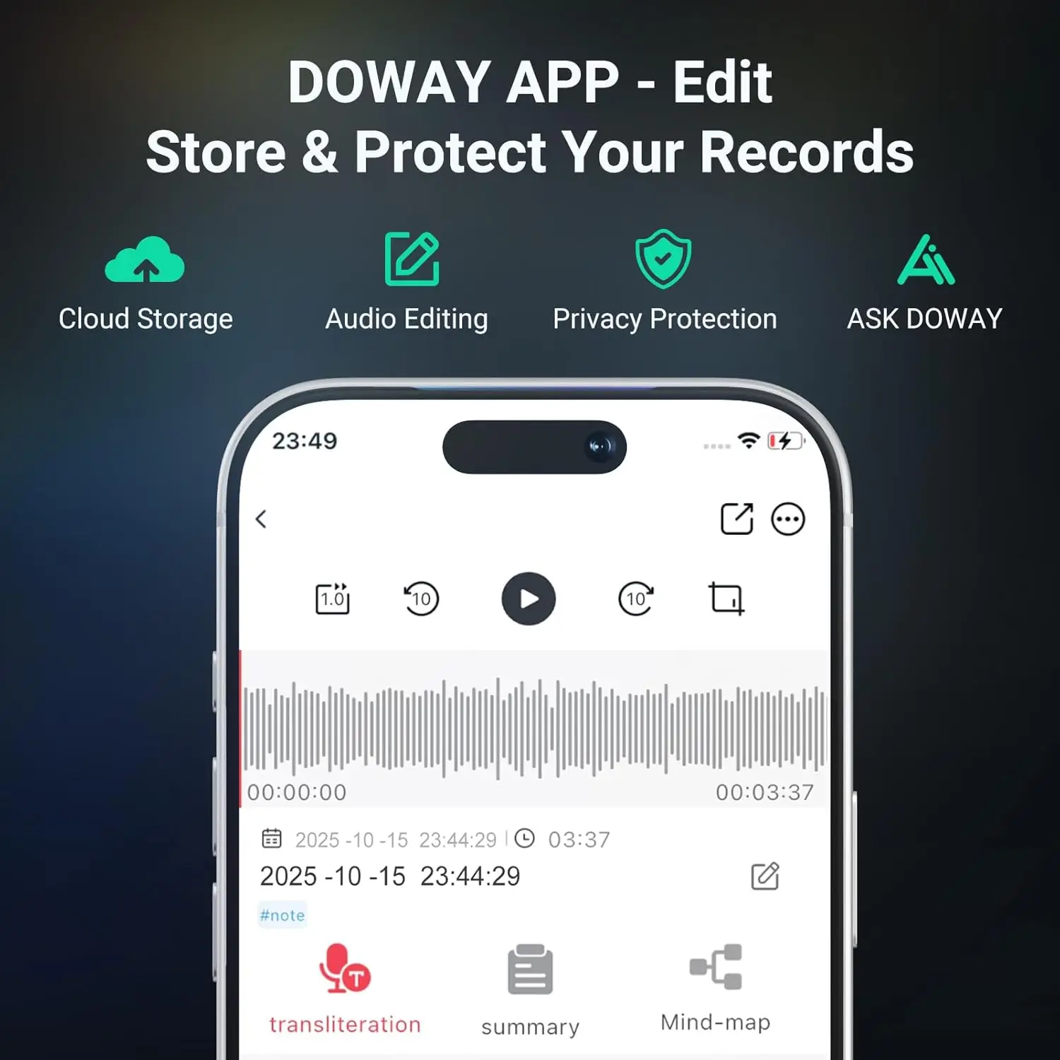 Ample Built-in Storage & Secure Cloud Backup:Equipped with 64GB of internal memory, this AI voice recorder stores hundreds of hours of high-quality audio without the need for an SD card. All recordings are automatically saved to encrypted cloud storage, ensuring complete privacy and preventing data loss. Easily access and manage your files anytime, anywhere via the dedicated DOWAY app.