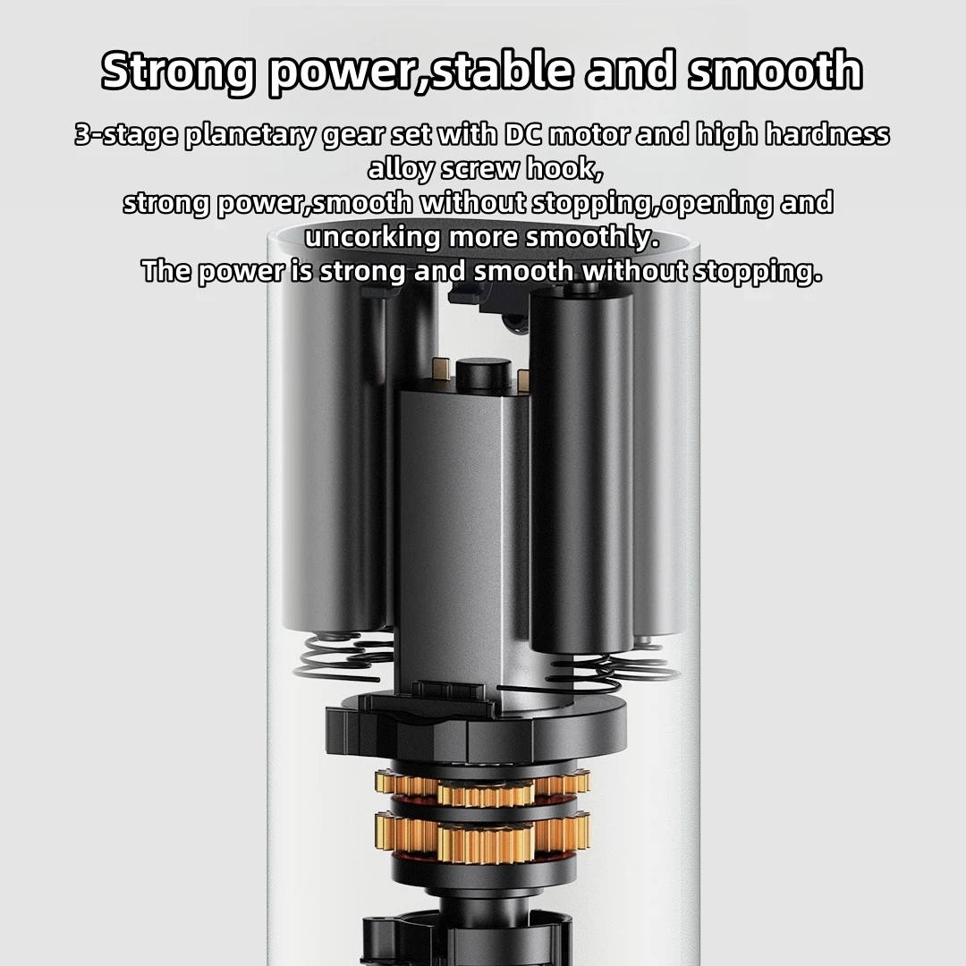 The 3-stage planetary gear set is equipped with a DC motor and a high-hardness alloy spiral hook, which is powerful, smooth and without pause, and the bottle is opened and uncorked more smoothly.