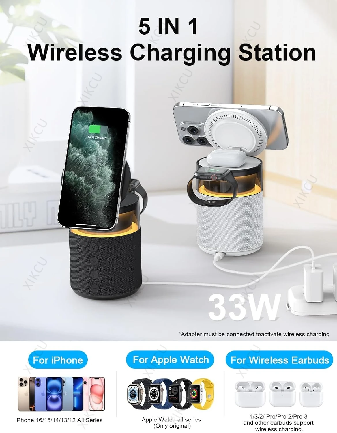 Press and hold the third button to power on, then immediately press the same button five times consecutively to clear its Bluetooth pairing history. After that, enable Bluetooth on your new device, search “MAGNETIC 5-IN-1 SPEAKER” and connect it.