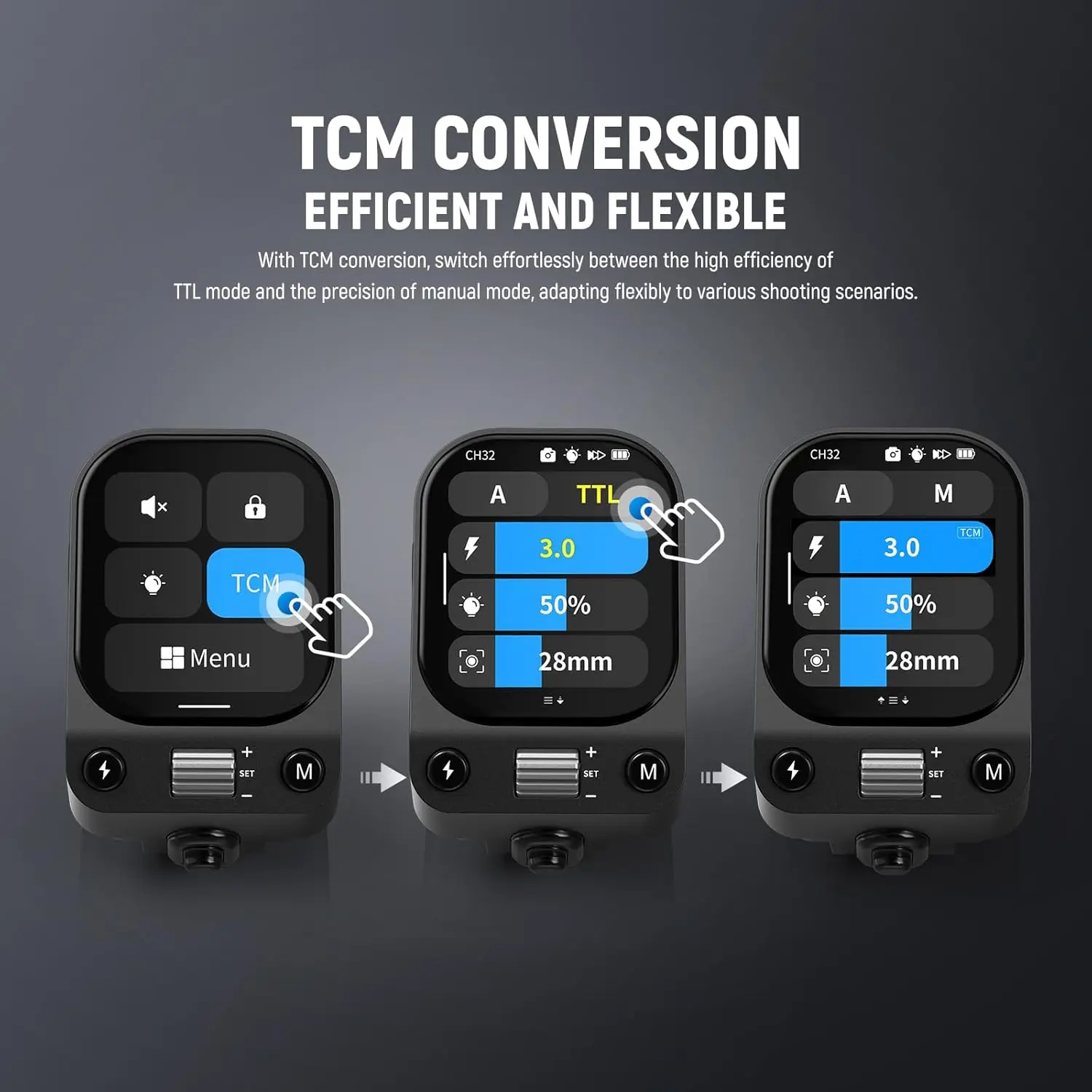 【Professional Flash Trigger with Touchscreen】 The wireless flash trigger features an OLED touchscreen with adjustable brightness, and allows for button controls even with gloves in winter. Supports TTL automatic flash, 1/8000s high speed sync, flash exposure compensation (FEC), manual flash, one click TCM switch, stroboscopic flash, modeling lamp control, zooming, single point triggering, group control, etc. Note: Disable the single contact mode for TTL and Strobe modes