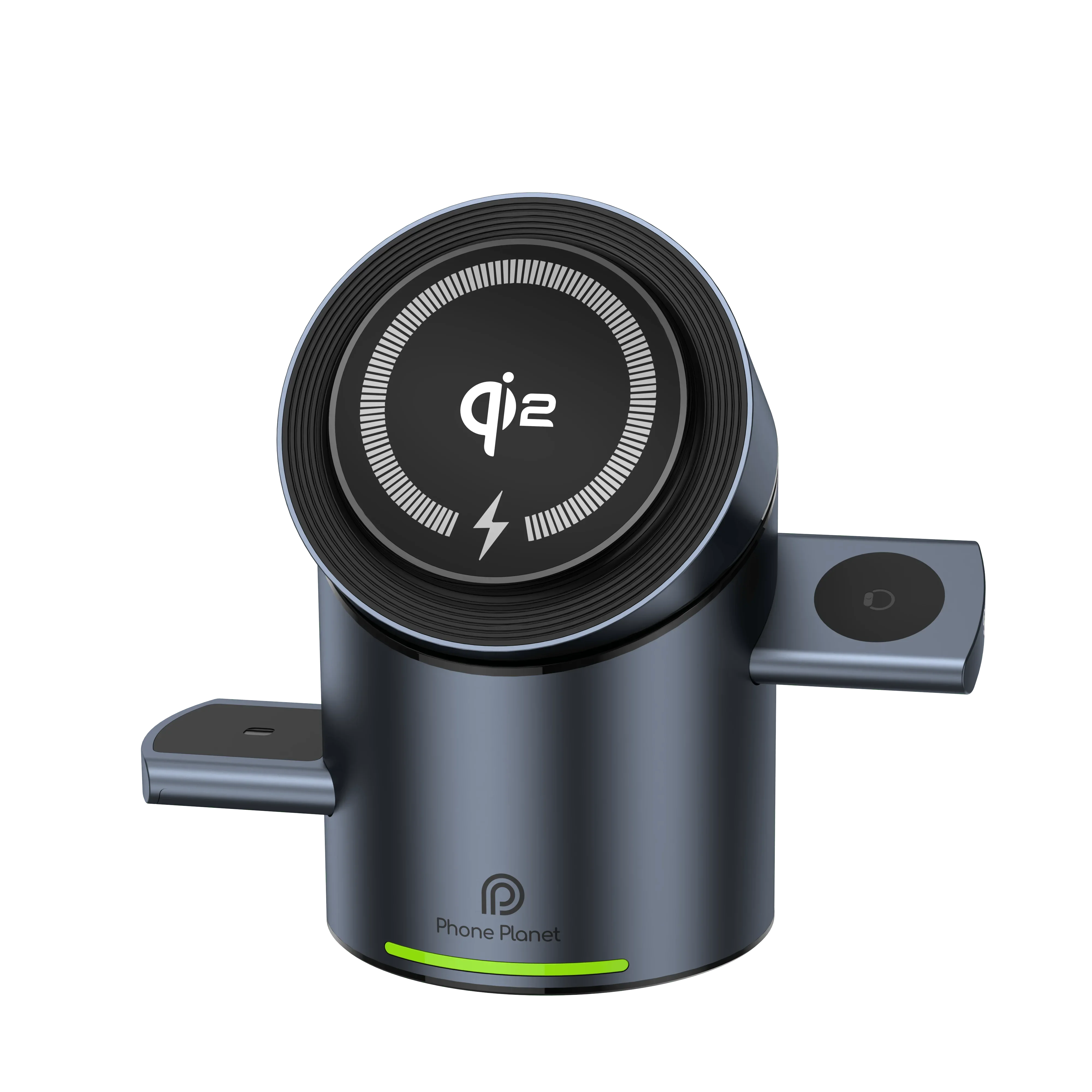 This charger is designed to work seamlessly with Apple iPhone, iWatch, and Airpods, offering a convenient charging solution for multiple devices.
